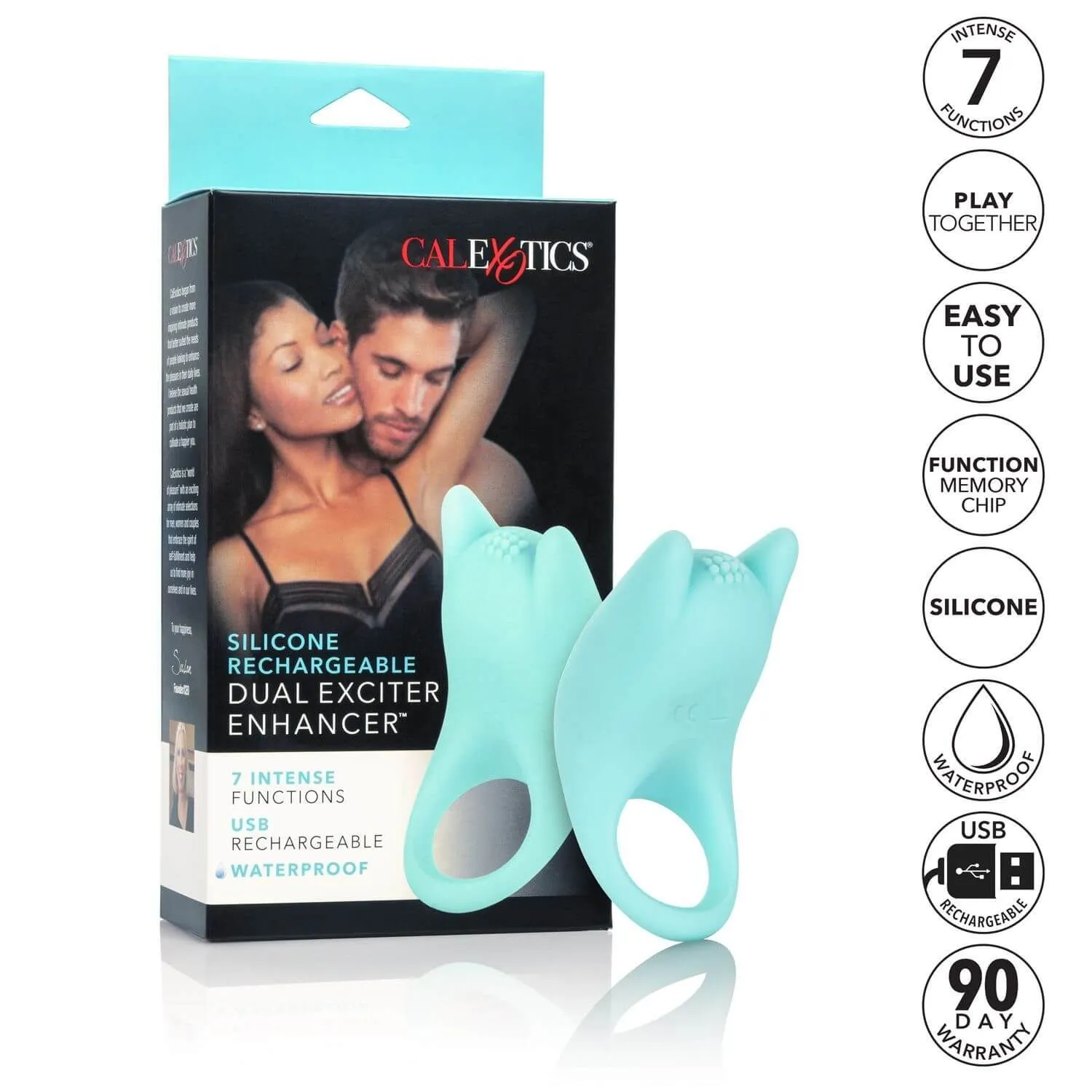 Эрекционное кольцо Dual Exciter Enhancer от компании California Exotic Novelties сможет подарить обоим партнерам незабываемые ощущения и новый чувственный опыт благодаря нескольким режимам вибрации и более продолжительной интимной близости. Кольцо сделано из медицинского силикона, оно приятно на ощупь и хорошо тянется, благодаря чему носить его будет комфортно. Оно поможет мужчине укрепить эрекцию и замедлить эякуляцию за счет притока крови к члену. Небольшие рожки и пупырышки в то же время будут ласкать эрогенные зоны женщины, делая ее удовольствие более интенсивным.
