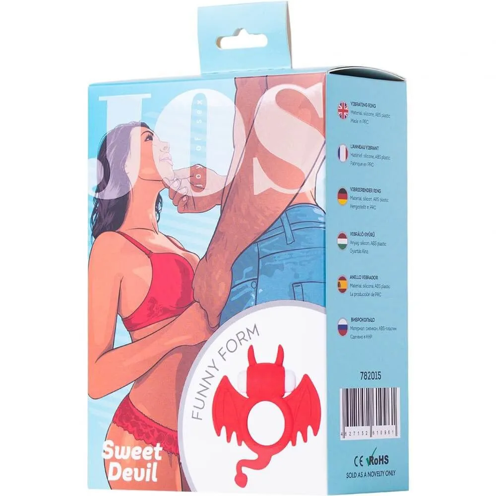 Виброкольцо SWEET DEVIL от JOS - это секс игрушка в виде красного дьявола, которая надевается на половой член, перекрывая отток крови, и следовательно, усиливает эрекцию и замедляет процесс семяизвержения. При этом вибрирующая часть кольца дополнительно стимулирует женщину.