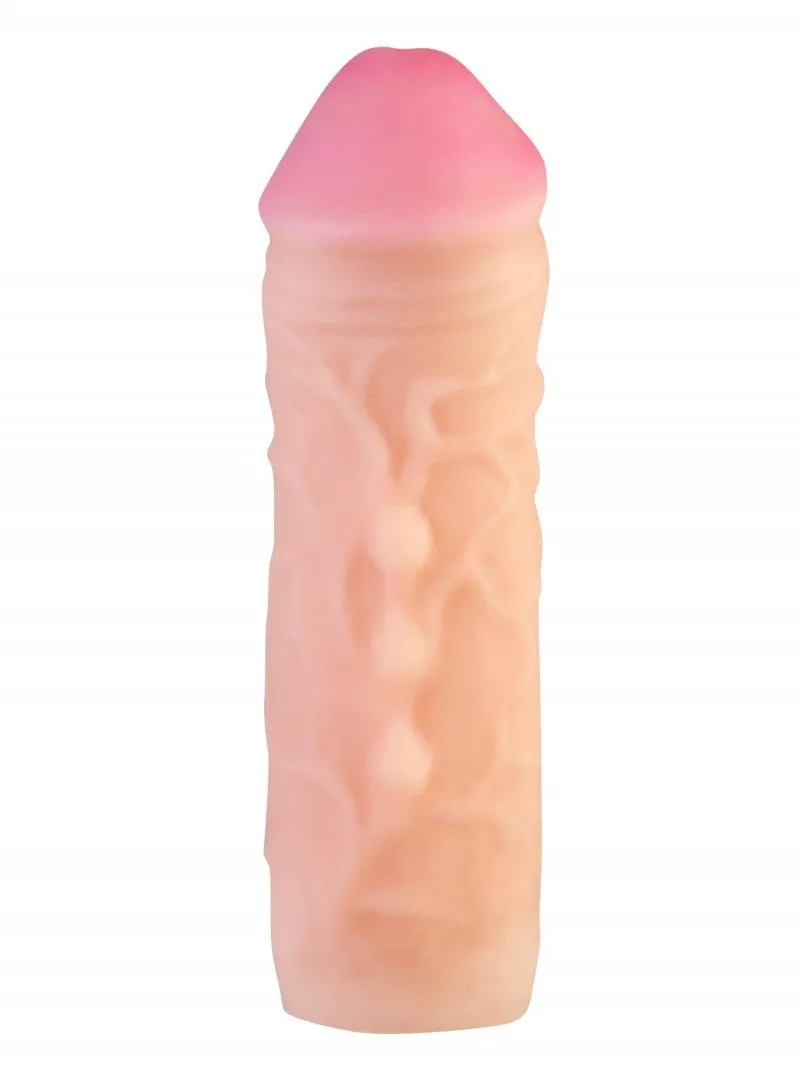 Насадка-удлинитель на пенис обеспечивает увеличение размера как в длину, так и в толщину. Сделана из полимера, создающего имитацию мягкой, шелковистой "кожи" с ощущением реального фаллоса при интимном контакте. Насадка увеличивает время близости и компенсирует анатомическое несоответствие партнеров. Тело насадки ровное, гладкое, с небольшой головкой. Благодаря высокой эластичности материала насадка плотно обхватывает и надежно прилегает к члену, как вторая кожа. Для дополнительной фиксации имеется петля для крепления под мошонкой. Размер и объем петли позволяет удерживать насадку и обеспечивает чувственную стимуляцию, сделав акт продолжительнее. Тело насадки с выраженным рельефом из вен и выступающих узелков. Головка ярко выраженная, массивная.