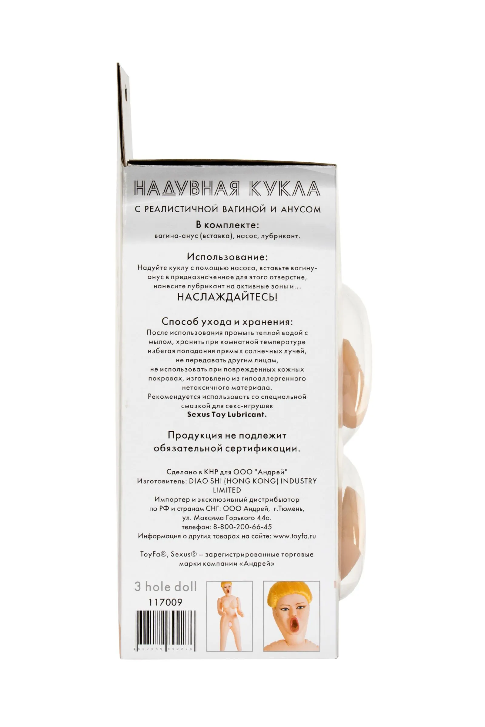 Эта надувная кукла с приоткрытым ротиком обладает соблазнительными отверстиями, выполненными из киберкожи. Такие анус и вагина практически ничем не отличаются от настоящих: они нежные и очень приятные на ощупь. А главное — они всегда готовы принять разгорячённую плоть! Остаётся лишь решить, кто будет ублажать сегодня — надувная блондинка, брюнетка, шатенка или рыжая. Рост 160 см.