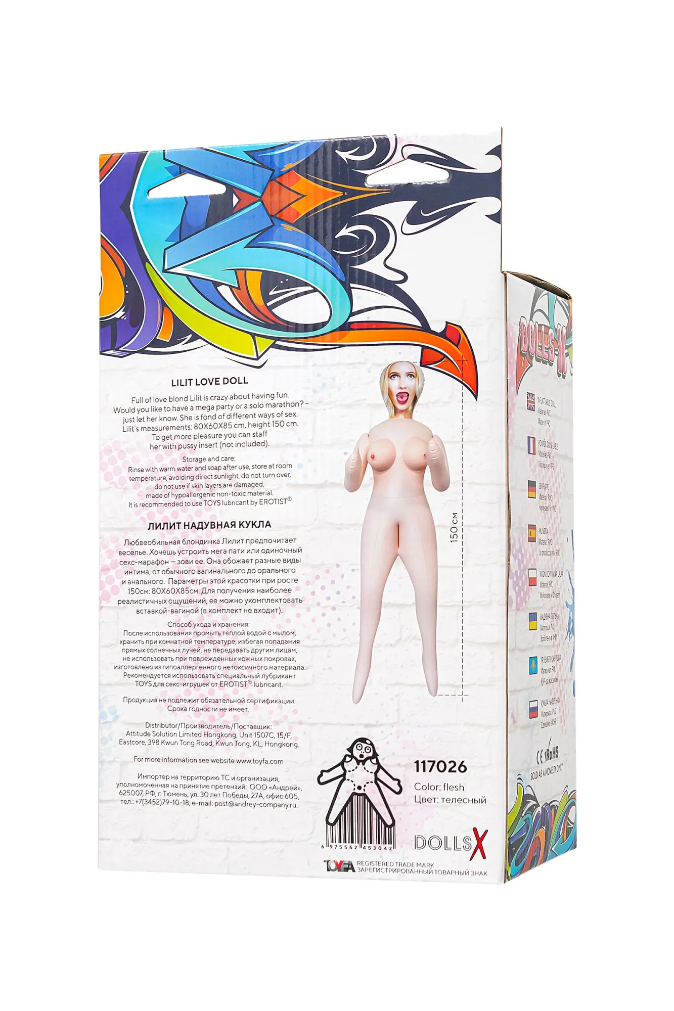 Любвеобильная блондинка Лилит предпочитает веселье. Хочешь устроить мега пати или одиночный секс-марафон - зови ее. Она обожает разные виды интима, от обычного вагинального до орального и анального. Параметры этой красотки при росте 150см: 80Х60Х85см. Для получения наиболее реалистичных ощущений, ее можно укомплектовать вставкой-вагиной (в комплект не входит).