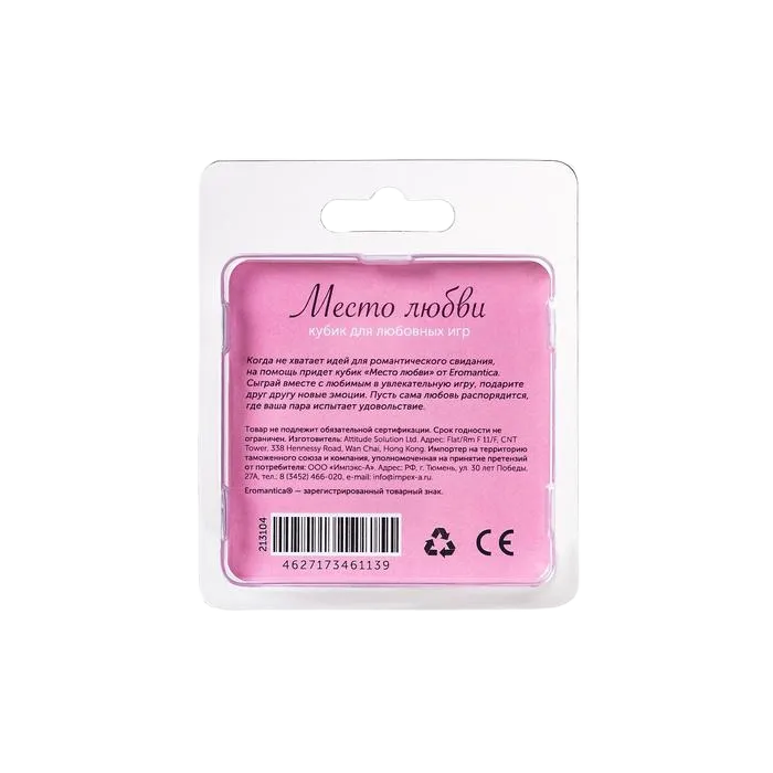 Когда не хватает идей для романтического свидания, на помощь придет кубик «Места любви» от Eromantica. Сыграй вместе с любимым в увлекательную игру, подарите друг другу новые впечатления. Кубик подскажет место вашей романтической, а скорее всего и сексуальной, встречи. Пусть сама любовь распорядится, где ваша пара испытает новые эмоции и все грани удовольствия.