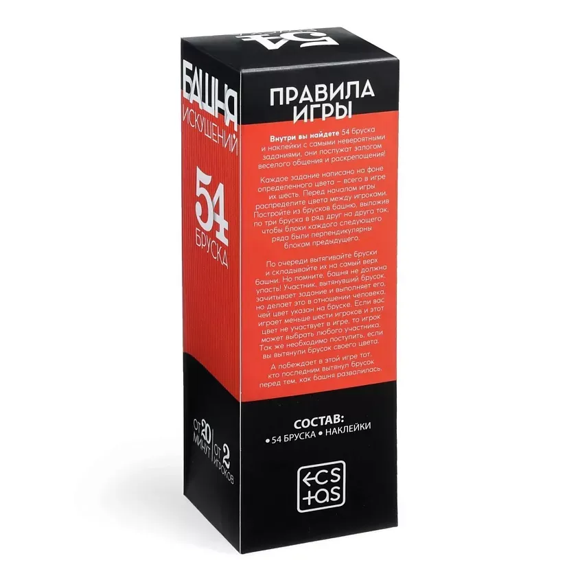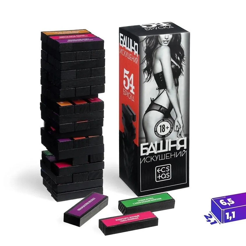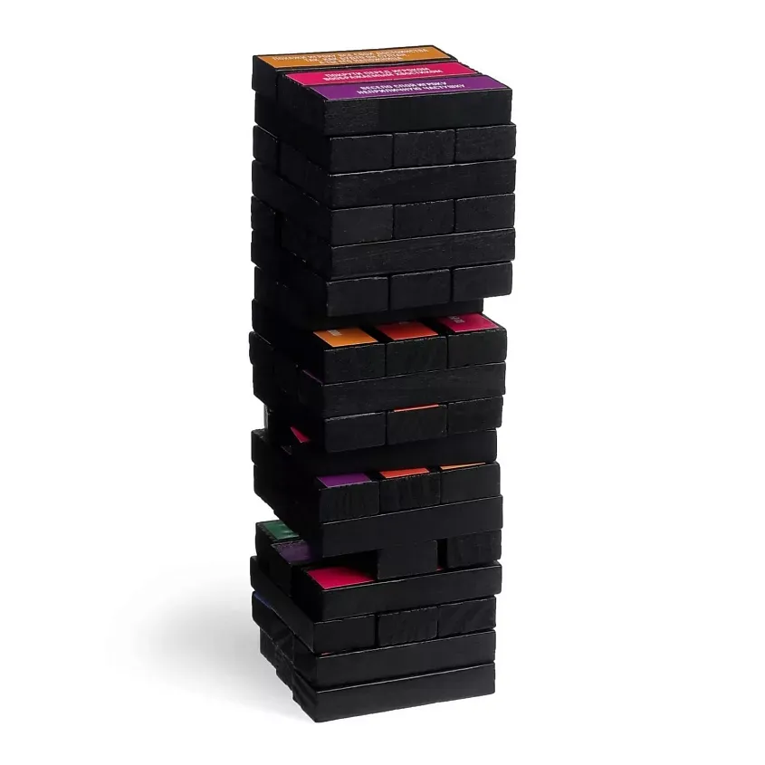Неожиданные задания разнообразят любой праздник! Каждое написано на фоне определённого цвета (всего их шесть). Перед началом игры распределите цвета между игроками. Постройте башню и вытягивайте бруски так, чтобы она не упала. Тот, кто вытянул деталь, зачитывает задание и выполняет его с тем игроком, чей цвет указан на бруске. Вас ждут веселье, много смеха и пикантных подробностей — устоять просто невозможно!