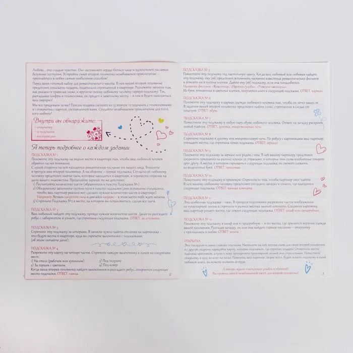Всё, что нужно — это правильно положить все подсказки. За зеркалом, в ванной комнате, в карманах одежды и в других местах вашей квартиры. Следуйте правилам, и тогда всё получится! Вашего любимого ждут ребусы, загадки, шифры и другие интересные задания.