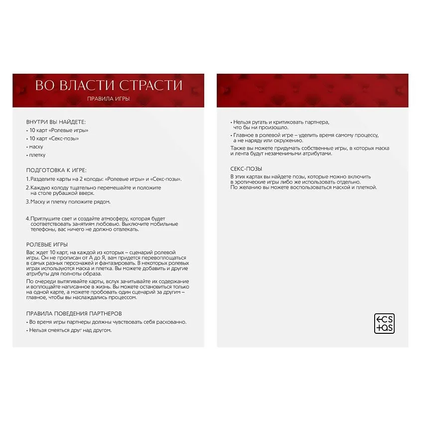 «Во власти страсти» – это серия эротических игр для двоих, главная особенность которой – большое количество ролевых игр и сценариев проведения романтического вечера. Серия включает себя карточные игры, наборы с аксессуарами, наборы кубиков и т.д.