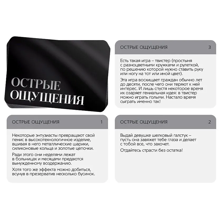 Добавьте перчинки в ваши отношения — поверьте, вы и ваша вторая половинка не разочаруетесь. Тяните карту, выполняйте указанное на ней задание и окунайтесь в мир острых ощущений, ярких эмоций и головокружительных чувств!