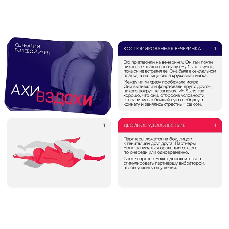 Как пользоваться набором? Разделите карты на 2 колоды — «Сценарии ролевой игры» и «Секс-позы». В первой колоде вас ждут сценарии пикантных ролевых игр. По очереди вытягивайте карты, зачитывайте их содержание и воплощайте написанное в жизнь. Вы можете остановиться только на одной карте, а можете пробовать один сценарий за другим — главное, чтобы вы наслаждались процессом. Позы, указанные в карточках «Секс-позы», можно включить в эротические игры, либо же использовать отдельно.