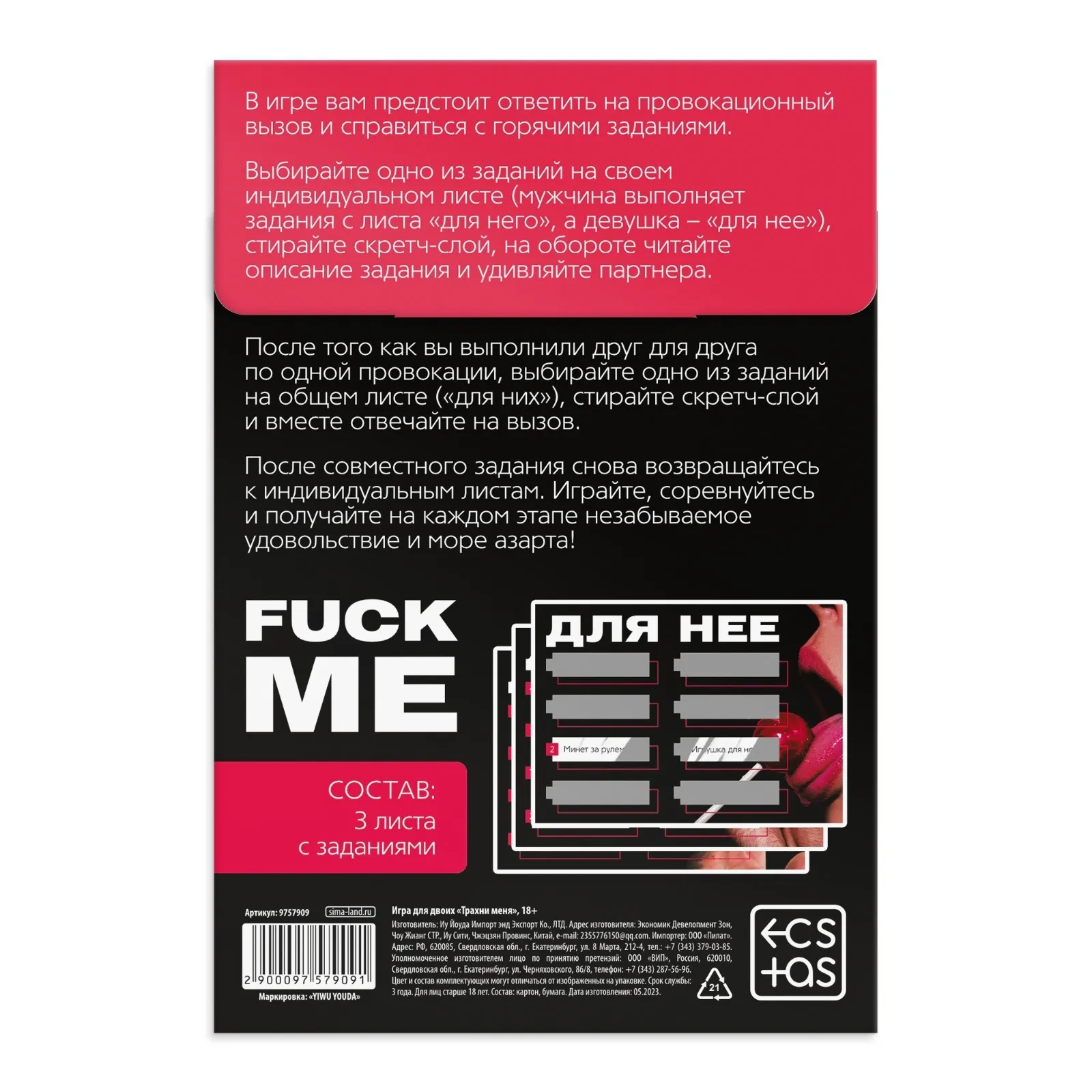 Представляем вам игру для двоих "Трахни меня" - захватывающую и страстную игру, которая подарит вам незабываемые моменты вместе. С помощью скретч-слоев вы будете открывать новые задания и фантазии, которые помогут вам раскрыть свою сексуальность и укрепить связь с партнером.