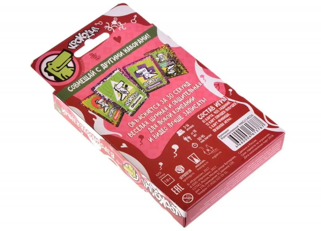 Игра "Крокодил взрослоотвязный" от компании Magellan подойдет для любой шумной и веселой компании. Правила игры просты и объясняются буквально за 30 секунд, поэтому Вы сможете практически сразу приступать к выполнению смешных заданий. Эта версия крокодила содержит в себе много смущающих или забавных слов, показать которые можно будет при помощи жестов или рисунков. Всего заданий - 405, поэтому скучать точно не придется! Так как коробочка с игрой достаточно компактная, ее всегда можно будет достать из сумки в самый унылый момент вечеринки, чтобы снова оживить ее.