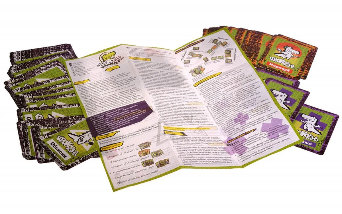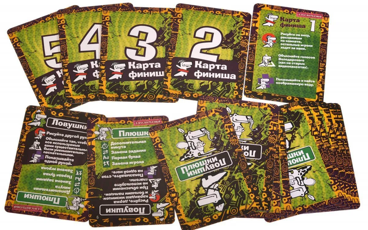 В комплекте Вы найдете 81 карту с заданиями, 12 карт с ловушками и плюшками, 5 карт финала, правила игры.