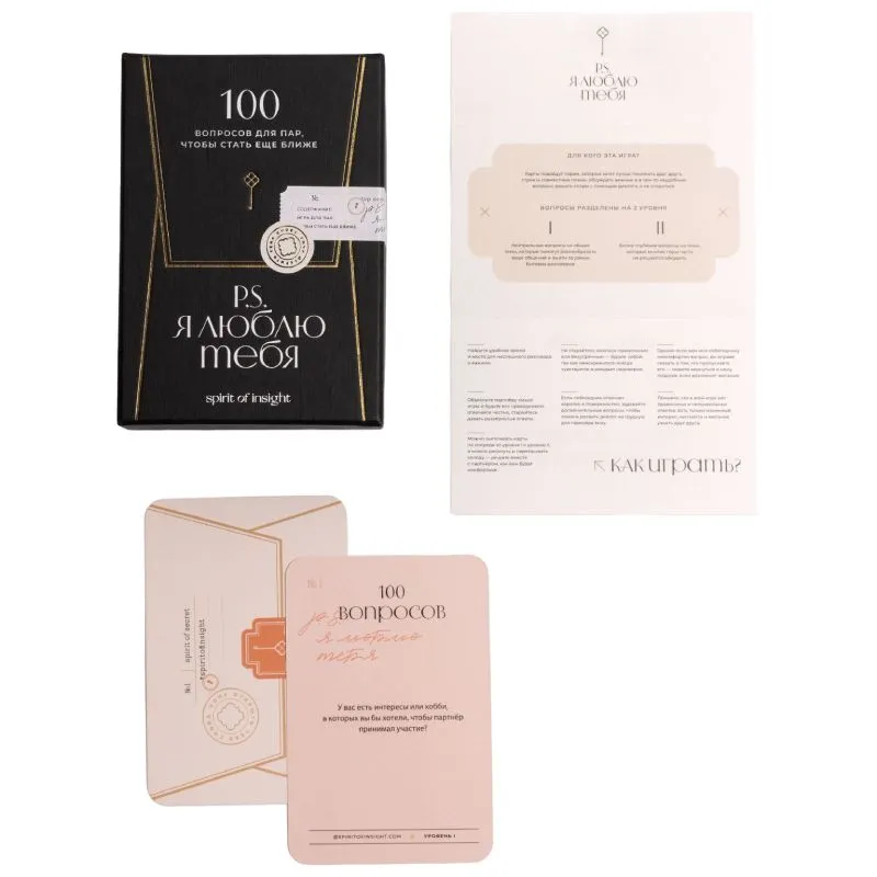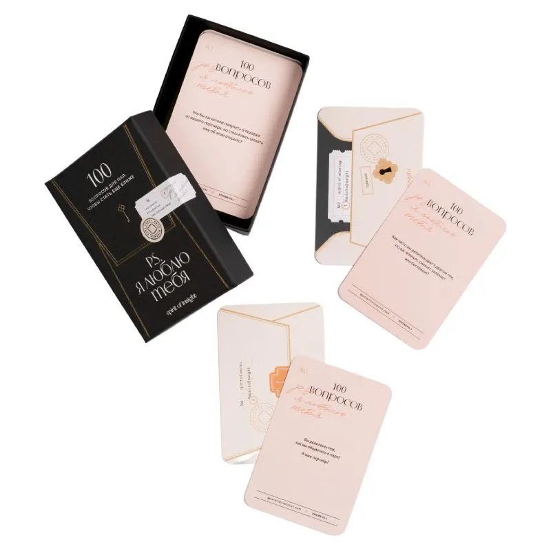 Специально для пар, которым важно качество отношений, которые хотят обсудить в игровой обстановке непростые личные вопросы, а также затронуть темы, на которые раньше не решались разговаривать, команда Insight разработала психологические карты «Давай станем ближе: 100 вопросов для знакомства с собой и партнером». С их помощью вы сможете разобраться как в своих собственных истинных желаниях, так и в желаниях своего партнера, а также осознаете, как эти потребности можно удовлетворить.