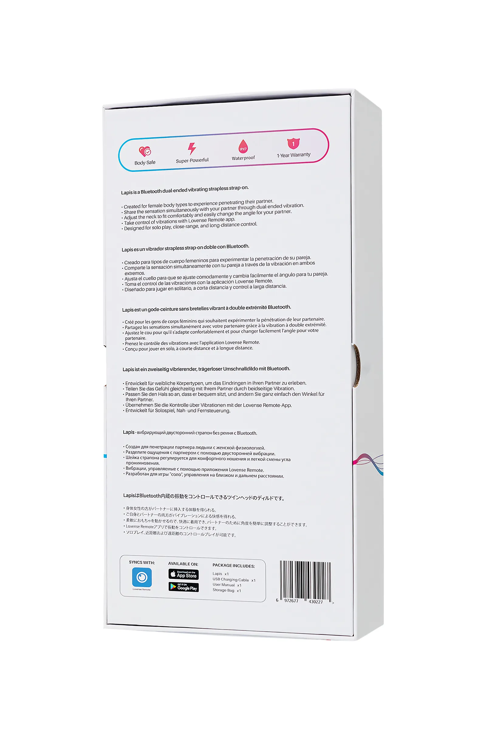 Погрузитесь в мир интригующих переживаний с Lapis от Lovense – гибким двусторонним вибрирующим страпоном. Перед вами уникальная возможность наслаждаться вместе с партнером, обмениваясь не только проникновением, но и вибрациями, создавая неповторимый опыт для обоих. Обмен ролями: Дайте новый оборот вашим интимным отношениям, меняясь ролями и открывая для себя захватывающие перспективы удовольствия. Управление вибрациями: Передайте контроль над вибрациями звуку, музыке или своему партнеру через приложение Lovense Remote, создавая интенсивность и продолжительность вибраций по вашему вкусу. Lovense не терпит ограничений в удовольствии. Для вас предусмотрено неограниченное количество возможностей в соло режиме или даже находясь на большом расстоянии от партнера. Исследование разнообразия: Lapis приносит новые ощущения, позволяя выбрать роль активного или пассивного пользователя, благодаря регулируемому безремневому страпону. Стимуляция точки G и клитора: Регулируемая гибкая шейка, выпуклый анатомический кончик и ребристые бороздки обеспечивают уникальную стимуляцию точки G и клитора для активного пользователя, принося непередаваемое удовольствие на всю область вульвы. Основная погружная часть имитирует фаллоимитатор, создавая объемные стимулирующие волны благодаря увеличенной головке и нежной ребристой поверхности. Легкий и гладкий: Супер легкий вес страпона (всего 315 грамм) обеспечивает комфортное ношение без лишнего утомления. Фирменный шелковистый силикон доставляет тактильное удовольствие. Гладкая текстура из безопасного для тела материала создает реалистичное ощущение кожи. Водонепроницаемость: Играйте в воде – в бассейне или душе, и легко мойте игрушку для быстрой и гигиеничной очистки. Три мощных мотора позволяют управлять уровнями интенсивности вибрации для каждой эрогенной зоны в отдельности. Позвольте ритму удовольствия вести вас туда, где инновации и удовольствие встречаются в гармонии. Мощные вибрации - три мотора Время использования - до 2,5 часов, время зарядки - до 1,5 часов Длина погружной части - 13,8 см, диаметр - 4,1 см. Длина носимой части - 8,7 см, диаметр - 3,8 см Водонепроницаемый IPX7 Работает с приложением Lovense Remote Управление в режиме HandsFree Что в комплекте: Двусторонний безремневый страпон с вибрацией Lapis USB Кабель для подзарядки Руководство пользователя Сумка для хранения