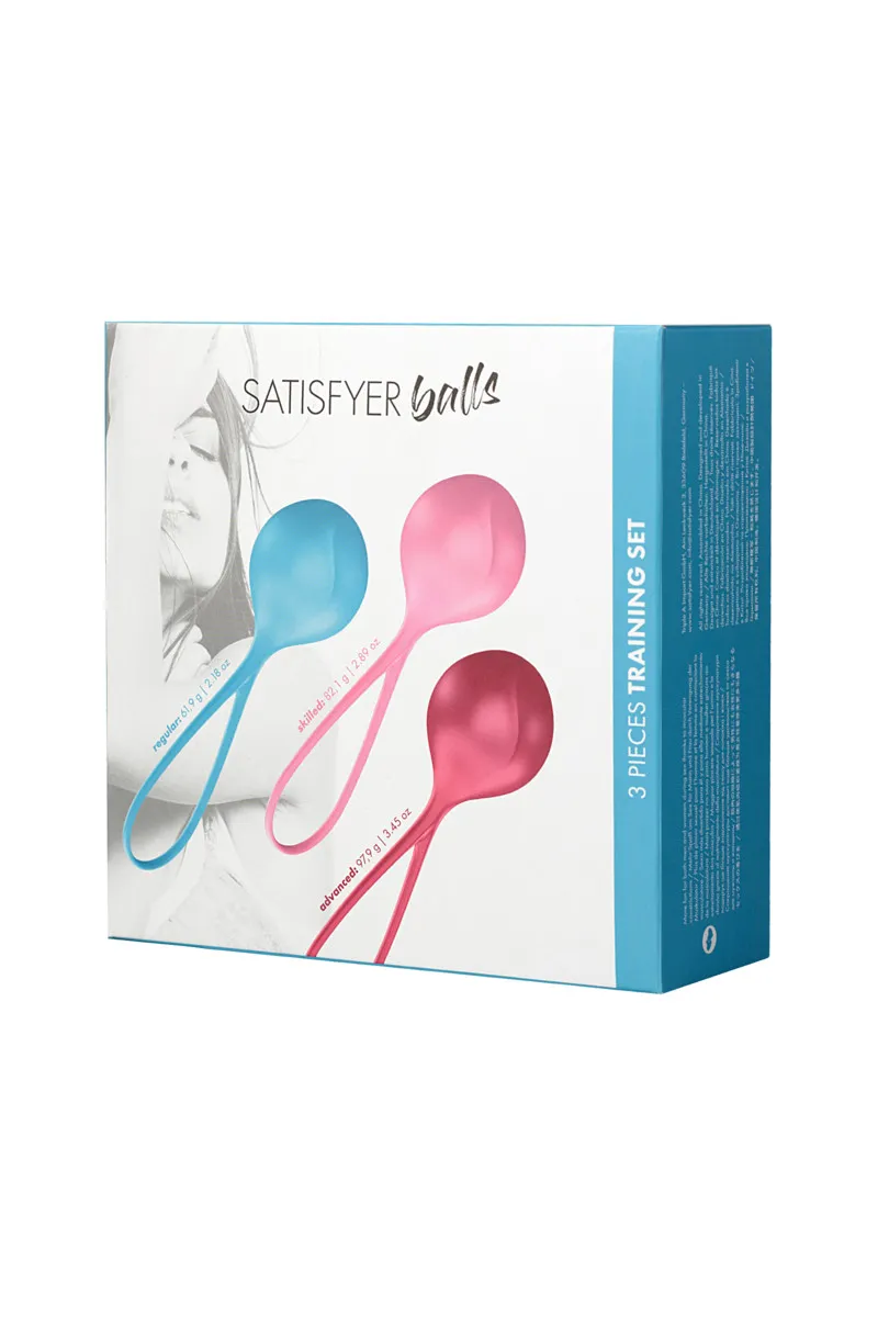 Набор из  трех вагинальных шариков Satisfyer разного веса. Они  изготовлены из нежнейшего медицинского силикона. Имеют удобную длинную ручку-петлю для безопасного использования. Все три шарика имеют одинаковый размер: 3,8 см в диаметре, рабочая длина - 4,5 см, а длина вместе с петлей - 16,6 см. В этом наборе самый легкий шарик весит 61,9 г (обычный), средний - 82,1 г (опытный), а самый тяжелый - 97,9 г (расширенный).  Всего несколько минут тренировок каждый день позволят вам взять свою любовную жизнь в свои руки! Укрепите свои мышцы и подарите себе взрывные оргазмы.