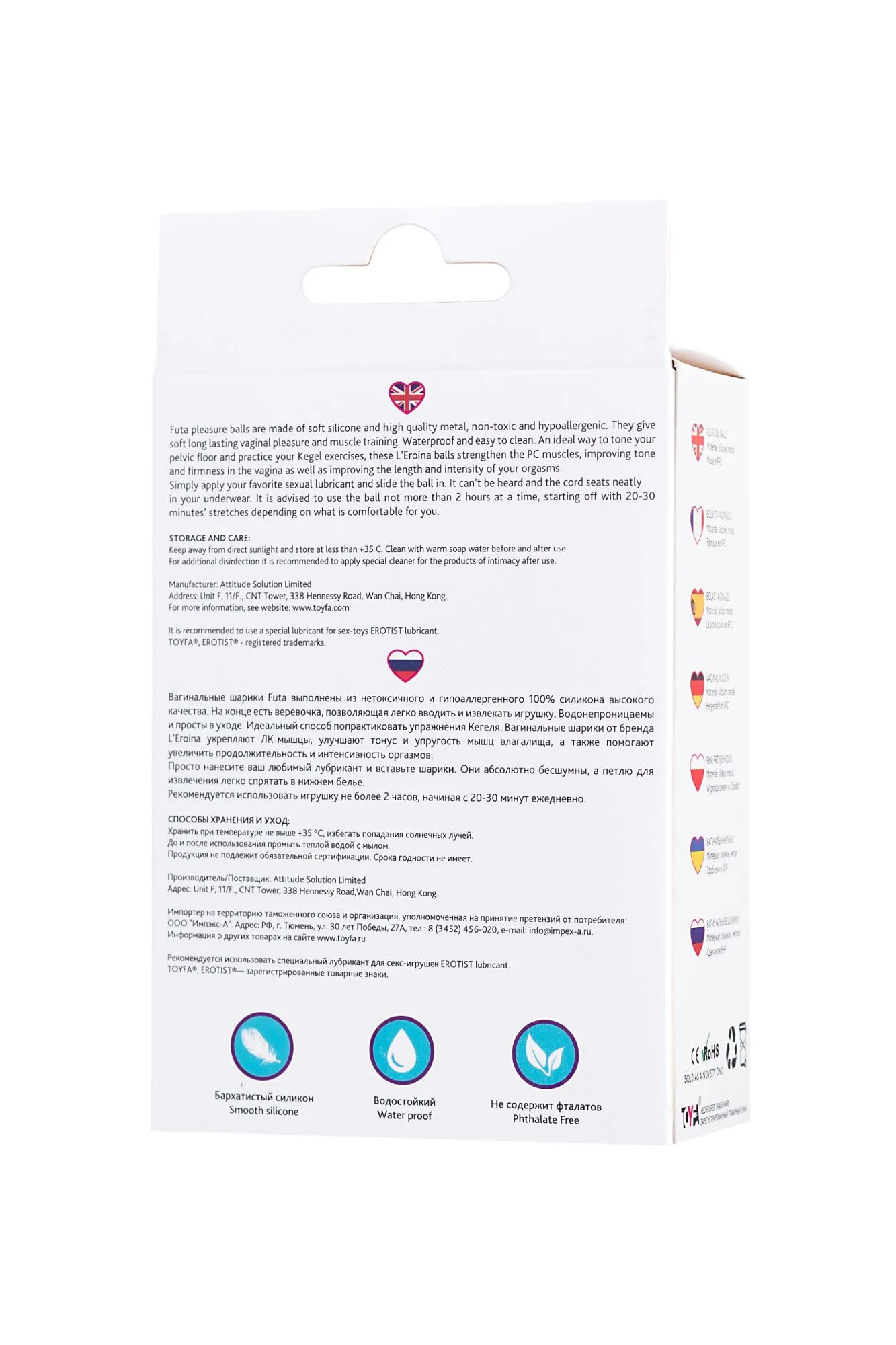 Вагинальные шарики Futa выполнены из нетоксичного и гипоаллергенного 100% силикона высокого качества. На конце есть веревочка, позволяющая легко вводить и извлекать игрушку. Водонепроницаемы и просты в уходе. Идеальный способ попрактиковать упражнения Кегеля. Вагинальные шарики от бренда L’Eroina укрепляют ЛК-мышцы, улучшает тонус и упругость мышц влагалища, а также помогают увеличить продолжительность и интенсивность оргазмов. Просто нанесите ваш любимый лубрикант и вставьте шарики. Они абсолютно бесшумны, а петлю для извлечения легко спрятать в нижнем белье. Рекомендуется использовать игрушку не более 2 часов, начиная с 20-30 минут ежедневно.