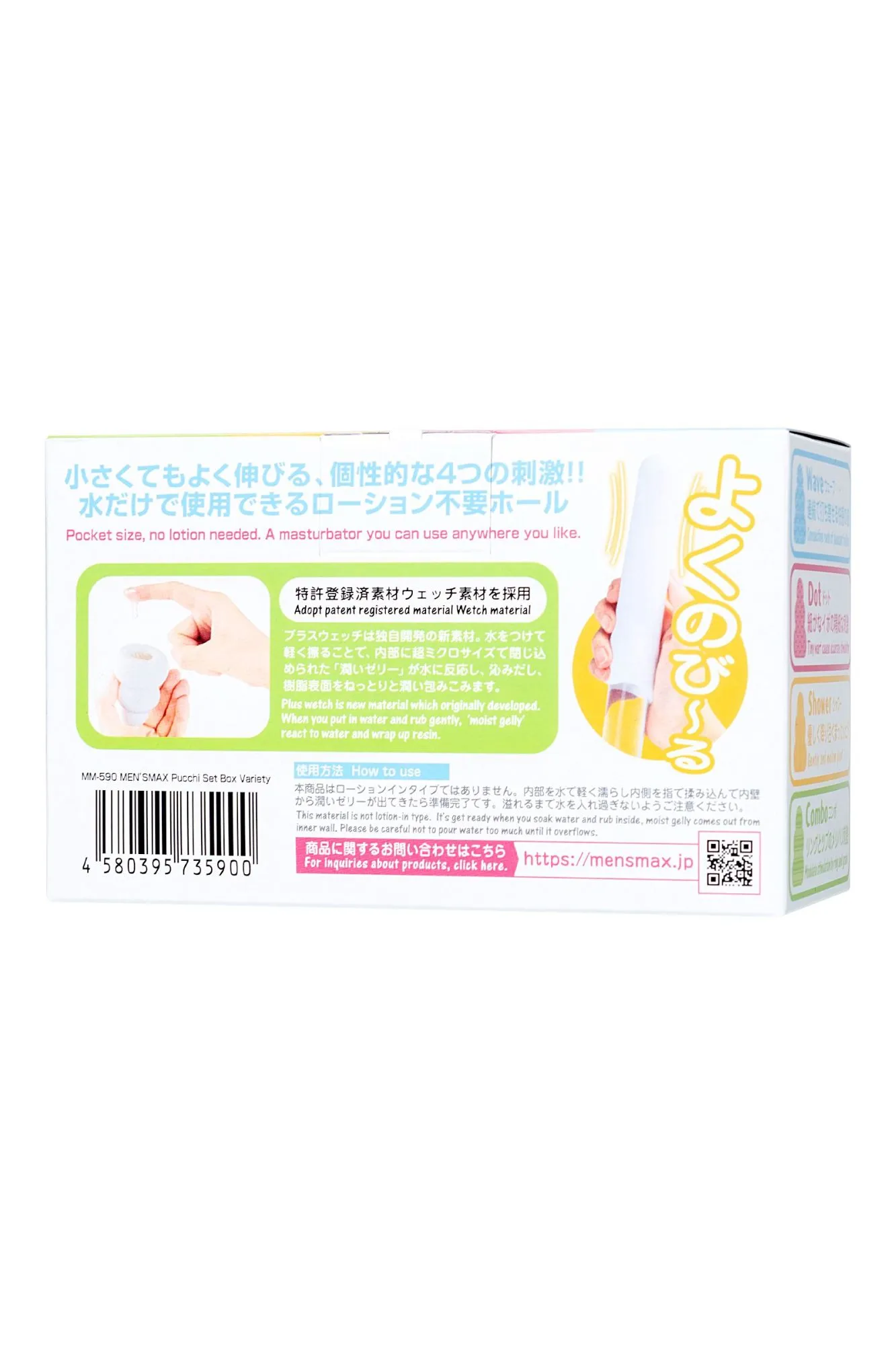 Обновленные карманные мастурбаторы MensMax Pucchi Set Box Variety в одном наборе. Эти разнообразные секс-игрушки имеют увеличенный размер, улучшенную эластичность, более четкий рельеф, и выделяют еще больше смазки – берите мастурбатор с собой куда угодно. Все что вам нужно – это MensMax Pucchi и немного воды. Самоувлажняющийся мастурбатор невероятно удобен в командировках, путешествиях и в повседневной жизни. Благодаря запатентованной японской технологии, инновационный материал +Wetch при взаимодействии с водой выделяет густой гель, усиливающий скольжение. Даже во время длительного массажа пениса гель не скатывается и не высыхает. Достаточно добавить немного воды, чтобы испытать полный спектр эмоций от интимного удовольствия. Многоразовая непрозрачная упаковка с замочком-клапаном служит мешочком для хранения. Упругий, но эластичный материал подходит для мужчин с любыми размерами пениса. Материал игрушки тактильно приятный и быстро принимает температуру тела. Чтобы усилить ощущения, добавьте теплую воду и наслаждайтесь температурными играми. MensMax Pucchi производят на новейшем оборудовании в Японии, что гарантирует качество и безопасность использования. В наборе 4 мастурбатора Pucchi с разнообразными рельефами: Wave, Dots, Shower и Combo. Каждая игрушка представляет собой мягкую трехъярусную елочку с одним отверстием. Внешняя сторона гладкая и нежная, а внутри разнообразные комбинированные рельефы, которые обеспечивают дополнительный массаж пениса, и особенно ярко ощущаются при стимуляции головки. Чем глубже проникновение, тем ощутимее стимуляция. Когда под рукой целый набор мастурбаторов – легко подобрать нужный рельеф под настроение, или использовать несколько игрушек одновременно. Инструкция: Достаньте мастурбатор из упаковки и налейте в него немного воды (чайную ложку). Старайтесь не намочить внешнюю сторону игрушки, чтобы смазка не мешала вам в процессе. Распределите образовавшийся гель по внутренней поверхности девайса. Начните с массажа головки, так вы сможете получить максимальное наслаждение от рельефа и настроиться на нужный лад. Совершайте вращательные движения по часовой стрелке или против нее. Для предварительных ласк партнерши выверните мастурбатор наизнанку и наденьте на пальцы. После игр промойте Pucchi водой или средством для очистки игрушек. Когда израсходуете смазку мастурбатора, выбирайте лубриканты на водной основе.