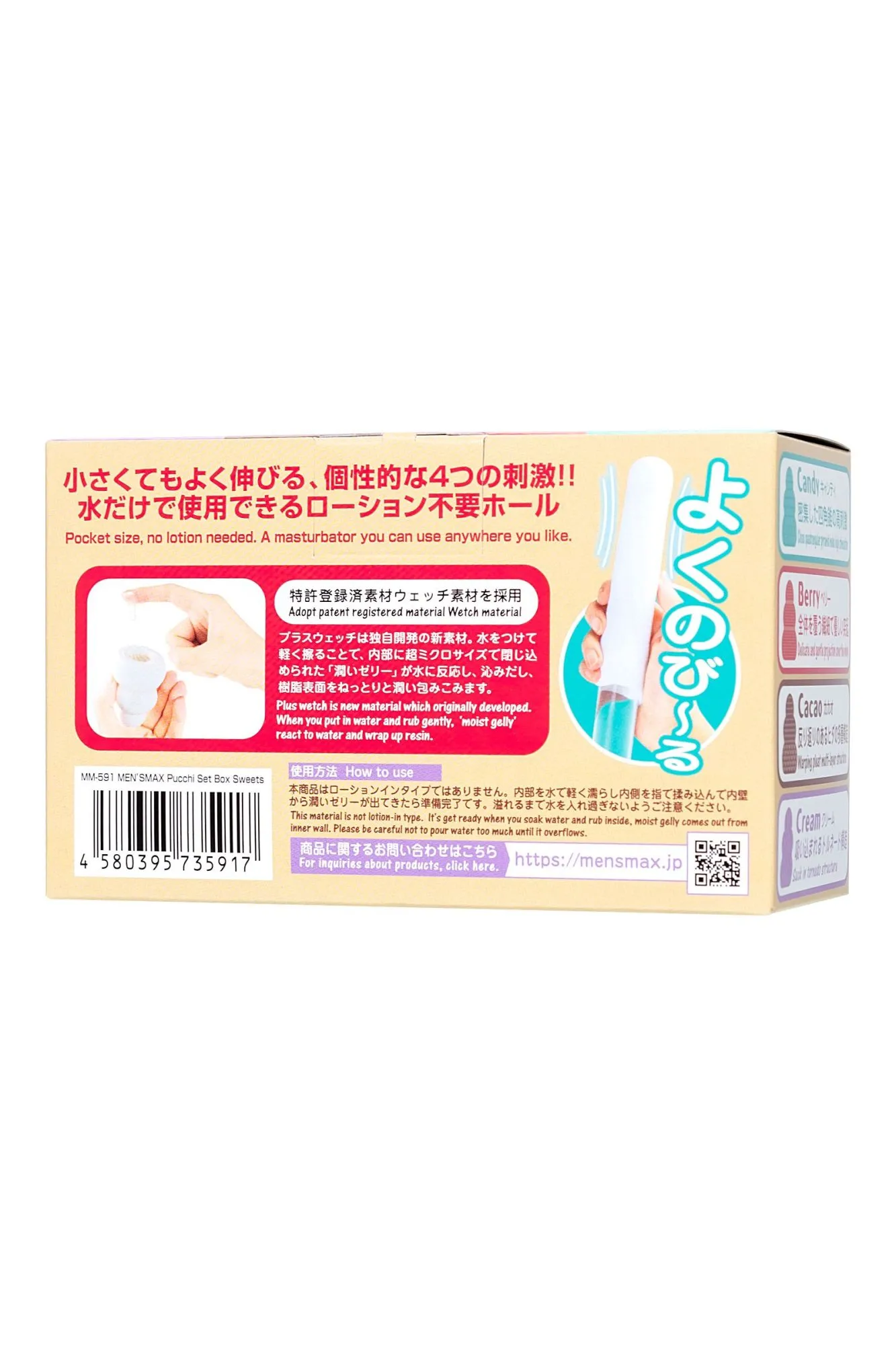 Обновленные карманные мастурбаторы MensMax Pucchi Set Box Sweets в одном наборе. Эти секс-игрушки имеют увеличенный размер, улучшенную эластичность, более четкий рельеф, и выделяют еще больше смазки – берите мастурбатор с собой куда угодно. Все что вам нужно – это MensMax Pucchi и немного воды. Самоувлажняющийся мастурбатор невероятно удобен в командировках, путешествиях и в повседневной жизни. Благодаря запатентованной японской технологии, инновационный материал +Wetch при взаимодействии с водой выделяет густой гель, усиливающий скольжение. Даже во время длительного массажа пениса гель не скатывается и не высыхает. Достаточно добавить немного воды, чтобы испытать полный спектр эмоций от интимного удовольствия. Многоразовая непрозрачная упаковка с замочком-клапаном служит мешочком для хранения. Упругий, но эластичный материал подходит для мужчин с любыми размерами пениса. Материал игрушки тактильно приятный и быстро принимает температуру тела. Чтобы усилить ощущения, добавьте теплую воду и наслаждайтесь температурными играми. MensMax Pucchi производят на новейшем оборудовании в Японии, что гарантирует качество и безопасность использования. В наборе 4 мастурбатора Pucchi с десертными рельефами: Candy, Berry, Cacao и Cream. Каждая игрушка представляет собой мягкую трехъярусную елочку с одним отверстием. Внешняя сторона гладкая и нежная, а внутри разнообразные комбинированные рельефы, которые обеспечивают дополнительный массаж пениса, и особенно ярко ощущаются при стимуляции головки. Чем глубже проникновение, тем ощутимее стимуляция. Когда под рукой целый набор мастурбаторов – легко подобрать нужный рельеф под настроение, или использовать несколько игрушек одновременно. Инструкция: Достаньте мастурбатор из упаковки и налейте в него немного воды (чайную ложку). Старайтесь не намочить внешнюю сторону игрушки, чтобы смазка не мешала вам в процессе. Распределите образовавшийся гель по внутренней поверхности девайса. Начните с массажа головки, так вы сможете получить максимальное наслаждение от рельефа и настроиться на нужный лад. Совершайте вращательные движения по часовой стрелке или против нее. Для предварительных ласк партнерши выверните мастурбатор наизнанку и наденьте на пальцы. После игр промойте Pucchi водой или средством для очистки игрушек. Когда израсходуете смазку мастурбатора, выбирайте лубриканты на водной основе