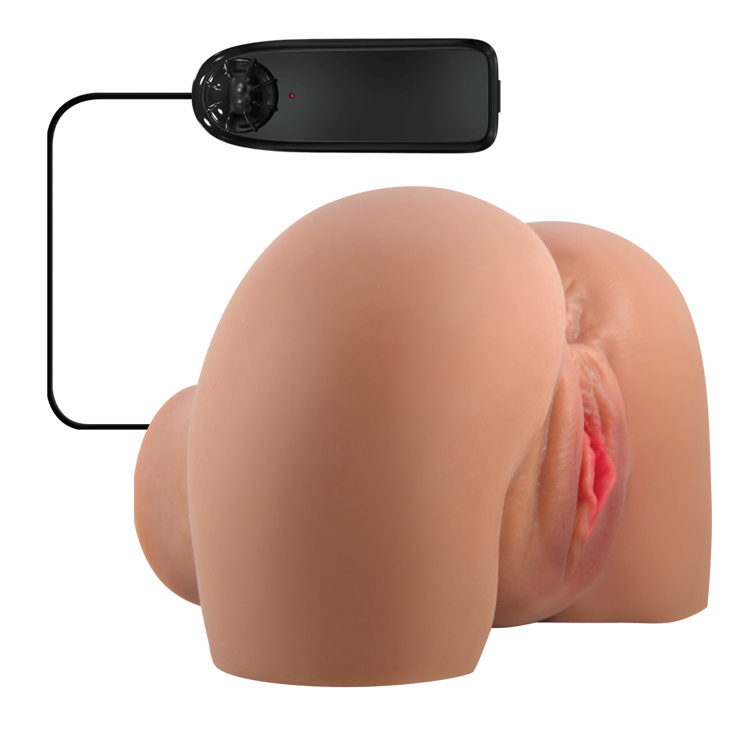 Мастурбатор в виде вагины с вибрацией. Имеет два отверстия. В комплекте идет виброяйцо с выносным пультом управления. Режим вибрации регулируется с помощью колесика, длина виброяичка 5,5 см, диаметр 2,5 см. Работает от 2-х батареек АА, в комплект не входят. Размеры мастурбатора: 18х13х14. Упаковка- картонная коробка с принтом. Страна изготовления- Китай.