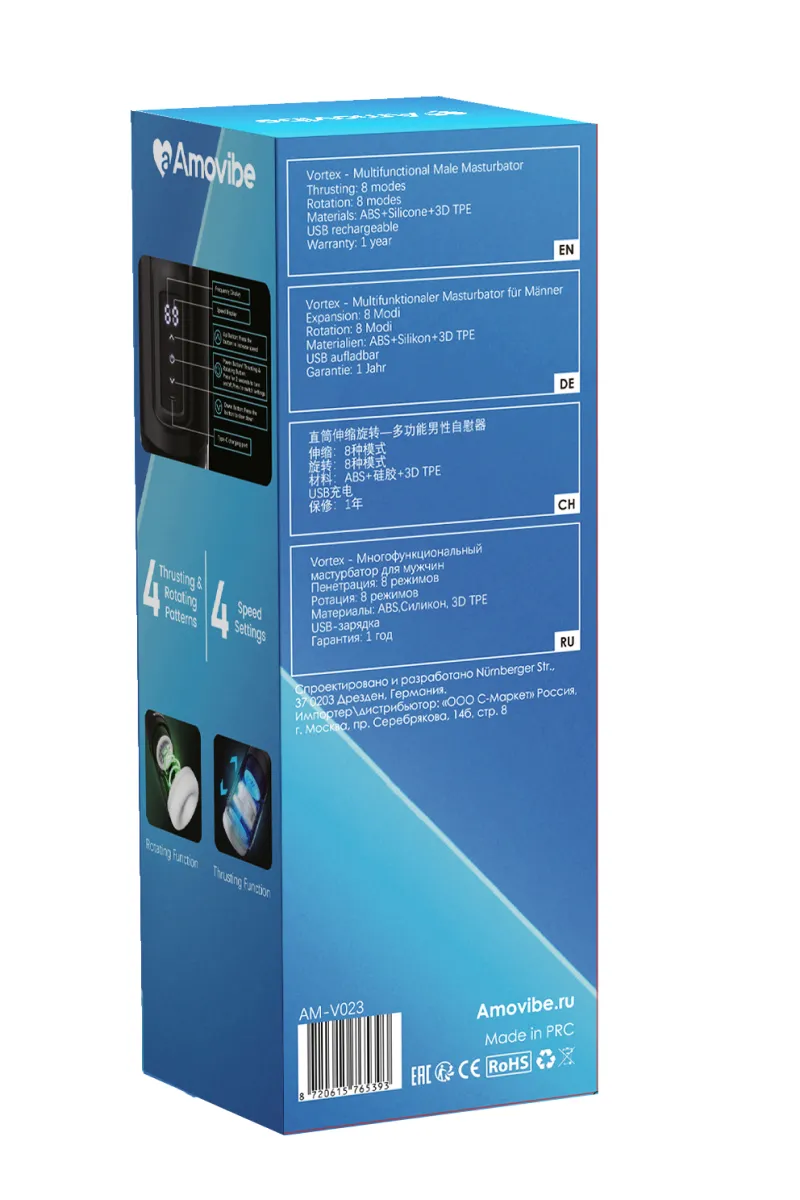 Vortex- мастурбатор нового полоколения с одновременной стимуляцией ствола и головки члена. Верхняя часть мастурбатора создает вращение на головке, а движущееся кольцо стимулирует ствол члена. Высокотехнологичные моторы обеспечивают 4 уникальных стиля стимуляции и 4 разные скорости. На корпусе удобная световая панель, на которой отображаются режимы.