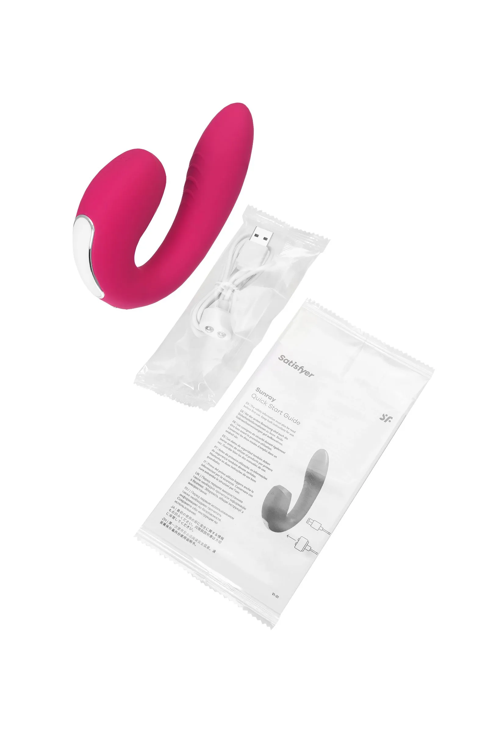 Добро пожаловать в удивительный мир Satisfyer Sunray – инновационного вибростимулятора с вакуумным отростком, который откроет для вас совершенно новые грани удовольствия и наслаждения. Нежные пульсации воздушных волн технологии Air Pulse обеспечивают бесконтактную стимуляцию клитора, погружая вас в волшебный мир невероятных ощущений. С Satisfyer Sunray вы можете выбрать из 11 уровней интенсивности вакуумной стимуляции, чтобы настроить его под ваши уникальные предпочтения. Но это еще не все! С мощными вибрациями, направленными на точку G, и ребристой структурой стержня для дополнительной стимуляции вагинальных эрогенных зон, Satisfyer Sunray создает идеальную форму для женских оргазмов. И не забудьте о двух мощных моторах, которые гарантируют интенсивные пульсации воздуха и вибрации, чтобы подарить вам самые сильные и потрясающие оргазмы. Но не только функциональность делает Sunray уникальным! Его гибкий механизм оснащен технологией Silicon Flex, что позволяет закрепить вставную часть игрушки в четырех положениях, чтобы максимально соответствовать вашей анатомии. Это обеспечивает идеальный комфорт и наслаждение во время использования. Управлять устройством также легко и удобно. Кнопки на корпусе и бесплатное приложение Satisfyer Connect с функцией управления смартфоном через Bluetooth открывают перед вами бесконечные возможности настройки. Создавайте свои уникальные режимы вибрации и даже синхронизируйте игрушку с музыкой – это по-настоящему волшебно! И конечно, Sunray сделан из шелковистого и высококачественного гипоаллергенного силикона, который приятен на ощупь и быстро принимает температуру вашего тела. Он водонепроницаемый, так что смело используйте его в душе или ванне, и легко очищайте теплой водой и специальными антимикробными спреями для интимных изделий. Откройте для себя новые грани удовольствия с Satisfyer Sunray и погрузитесь в мир незабываемых оргазмов и блаженства. Наслаждайтесь каждым мгновением интимных взаимодействий с этим идеальным вибростимулятором, который прокладывает путь к небесным ощущениям и удовольствию. Особенности: Возможность одновременного воздействия на клитор и зону G Управление кнопками на гибком корпусе. 10 режимов вибрации и 11 режимов вакуум-волновой стимуляции. Мягкий, эластичный силикон без запаха, без аллергенов и вредных для здоровья веществ. 100% водонепроницаемый - IPX7. Перезаряжаемый, USB-кабель.