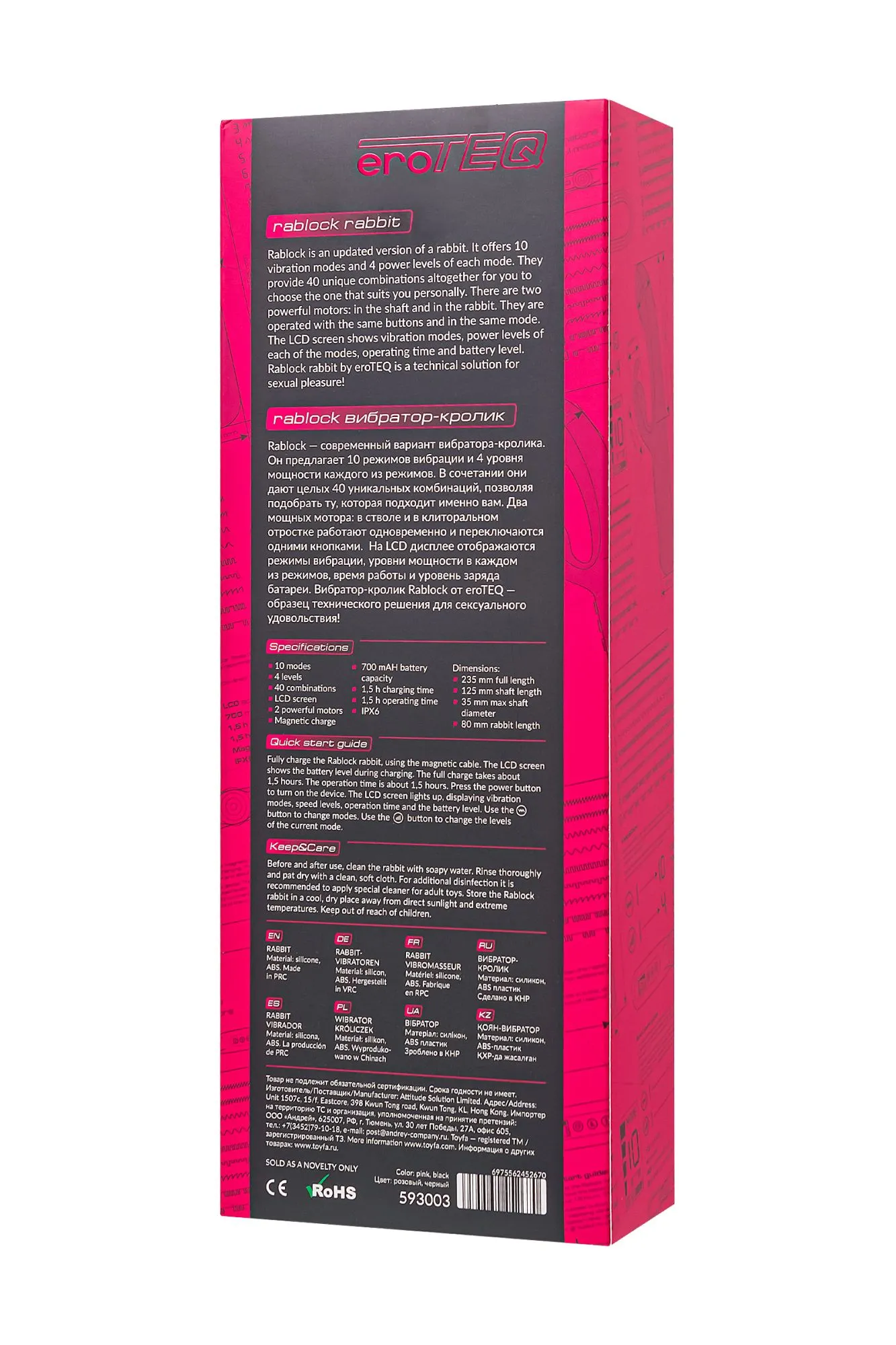 Традиционный вибратор-кролик Rablock от eroTEQ создан с заботой об интимном благополучии. Два мощных мотора, работающих вместе, обеспечивают бескомпромиссную эротическую стимуляцию. Кролик запрограммирован 10 режимами вибрации и 4 уровнями мощности. Сочетая эти параметры легко найти идеальный вибрационный рисунок – 40 уникальных комбинаций, чтобы подарить вам максимум удовольствия и неповторимый оргазм. Погружная часть вибратора обладает естественным изгибом и выразительной головкой, созданной для максимальной стимуляции зоны G. Рабочая длина вагинального отростка в 12,5 см и диаметр в 3,5 см обеспечивают идеальное попадание в центр вашего удовольствия с двух сторон одновременно! Клиторальный отросток с двумя ушками имеет прямой контакт с клиторальной зоной и позволяет экспериментировать легкими дразнящими прикосновениями или максимально тесным контактом. Возможности Rablock позволяют вам наслаждаться моментами интимного блаженства с полной уверенностью и комфортом. Три кнопки на корпусе с понятными обозначениями обеспечивают простое и комфортное управление вашим удовольствием. Революционная концепция Rablock начинается с LCD экрана, который предоставляет полный контроль над всеми функциями – режимами вибрации, временем работы и уровнем заряда батареи. Гладкая, бесшовная поверхность из высококачественного силикона не только дарит нежность, но и гарантирует абсолютную безопасность при каждом прикосновении. Сочетание соблазнительного розового оттенка и изысканного дизайна приносит удовлетворение и радость! Впечатляйтесь функционалом игрушки даже в душе, благодаря водонепроницаемой технологии IPX6, обеспечивающей простоту в уходе. Рекомендуется использовать лубрикант на водной основе. Технические характеристики: 10 режимов для настраиваемого удовольствия 4 уровня мощности для индивидуальных предпочтений LCD-экран для интуитивного контроля 2 мощных мотора для максимальной эффективности Время зарядки 1,5 часа для быстрого подзарядки Время работы 1,5 часа для долгих сессий удовольствия Магнитная USB зарядка для удобства использования Водонепроницаемость IPX6 для разнообразия вариантов использования