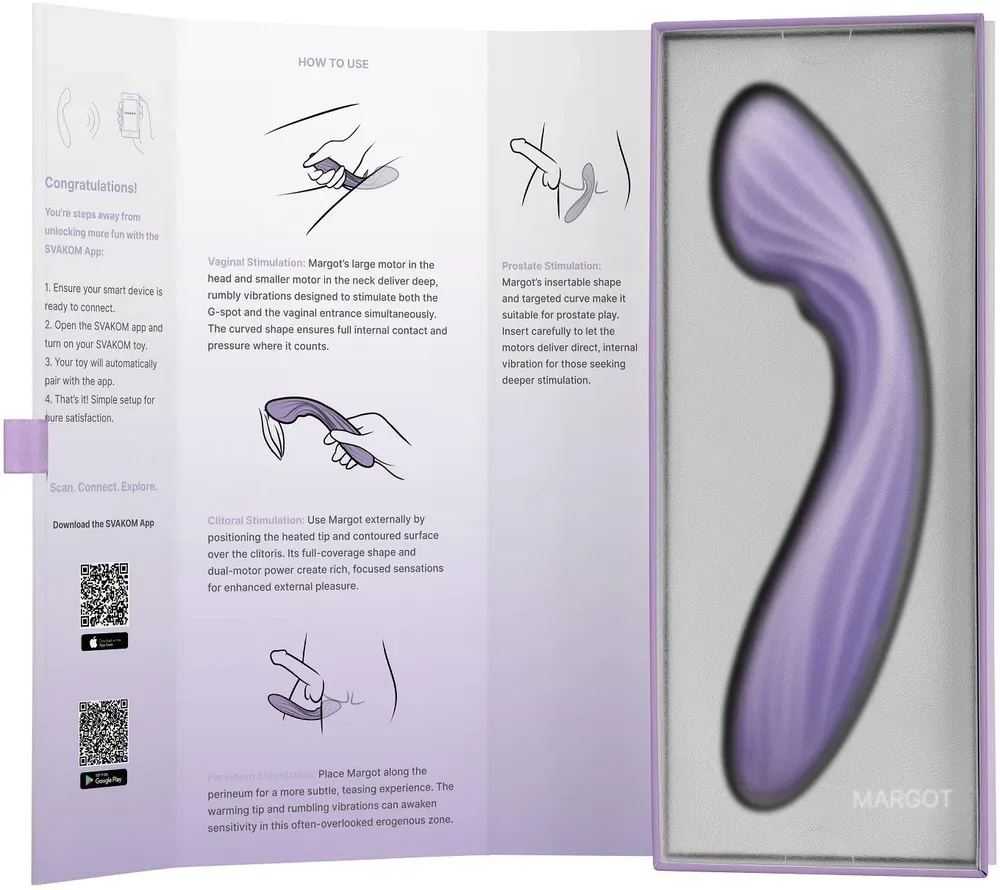 Предназначена для максимальной эффективности в области удовольствия. Конструкция охватывает зоны от точки G до клитора, обеспечивая комплексную стимуляцию — внутреннюю и внешнюю. Благодаря мощным вибрациям и продуманному дизайну, Margot создает ощущение погружения и позволяет экспериментировать с различными режимами возбуждения.