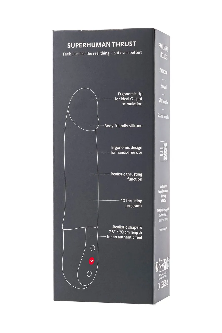 Благодаря 7 скоростям и 3 захватывающим ритмам, STRONIC REAL позволяет полностью настроить ваши ощущения, делая каждый сеанс уникальным. Независимо от того, жаждете ли вы интенсивной стимуляции или нежных, дразнящих ощущений, STRONIC REAL станет вашим надежным партнером, а эргономичный наконечник доставит удовольствие вашей точке G, как никогда раньше.