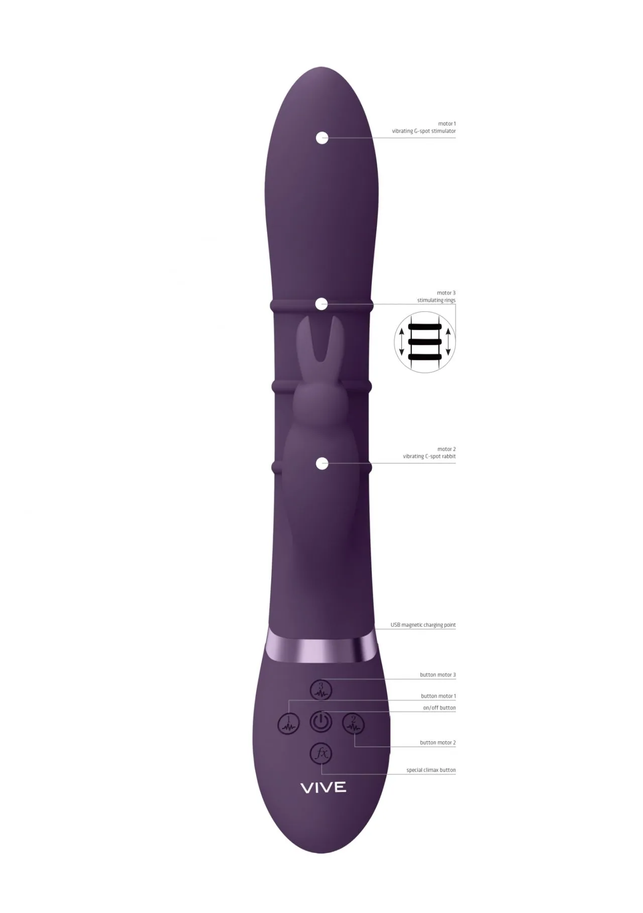 Изготовлено изделие из шелковистого медицинского (гипоаллергенного) силикона и как большинство моделей линейки VIVE имеет кнопку мгновенного оргазма, запуская все моторы на максимум одним касанием.