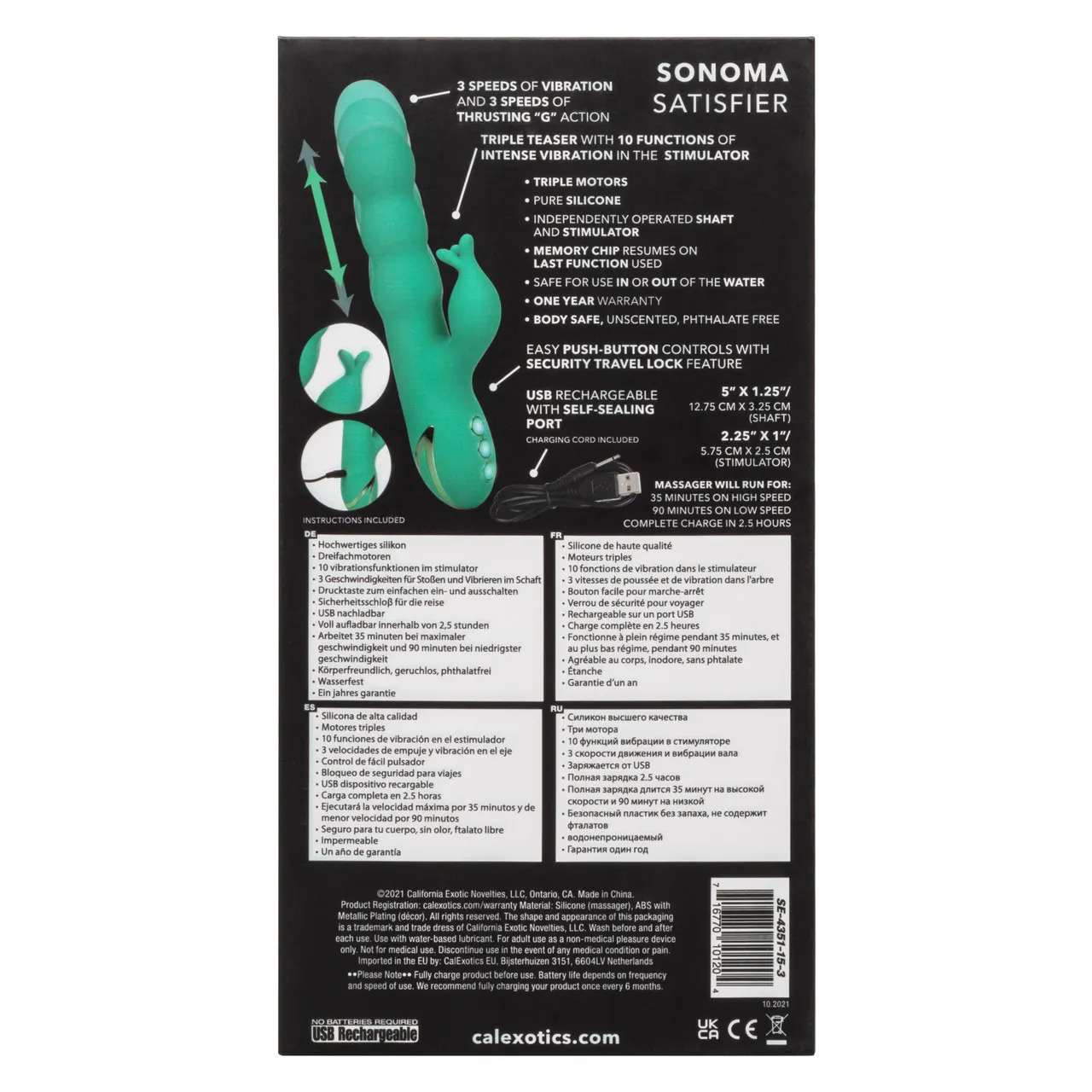 Вибромассажер SONOMA SATISFIER – перезаряжаемый мульти скоростной вибратор кролик из бесшовного материала с дополнительной обработкой. Вагинальный отросток у этой модели имеет волнистую форму и 3 функции «интенсивное поступательное воздействие». Клиторальный отросток с тремя лепестками на кончике имеет отдельный мощный виброэлемент, обеспечивающий 10 режимов интенсивной вибрации.