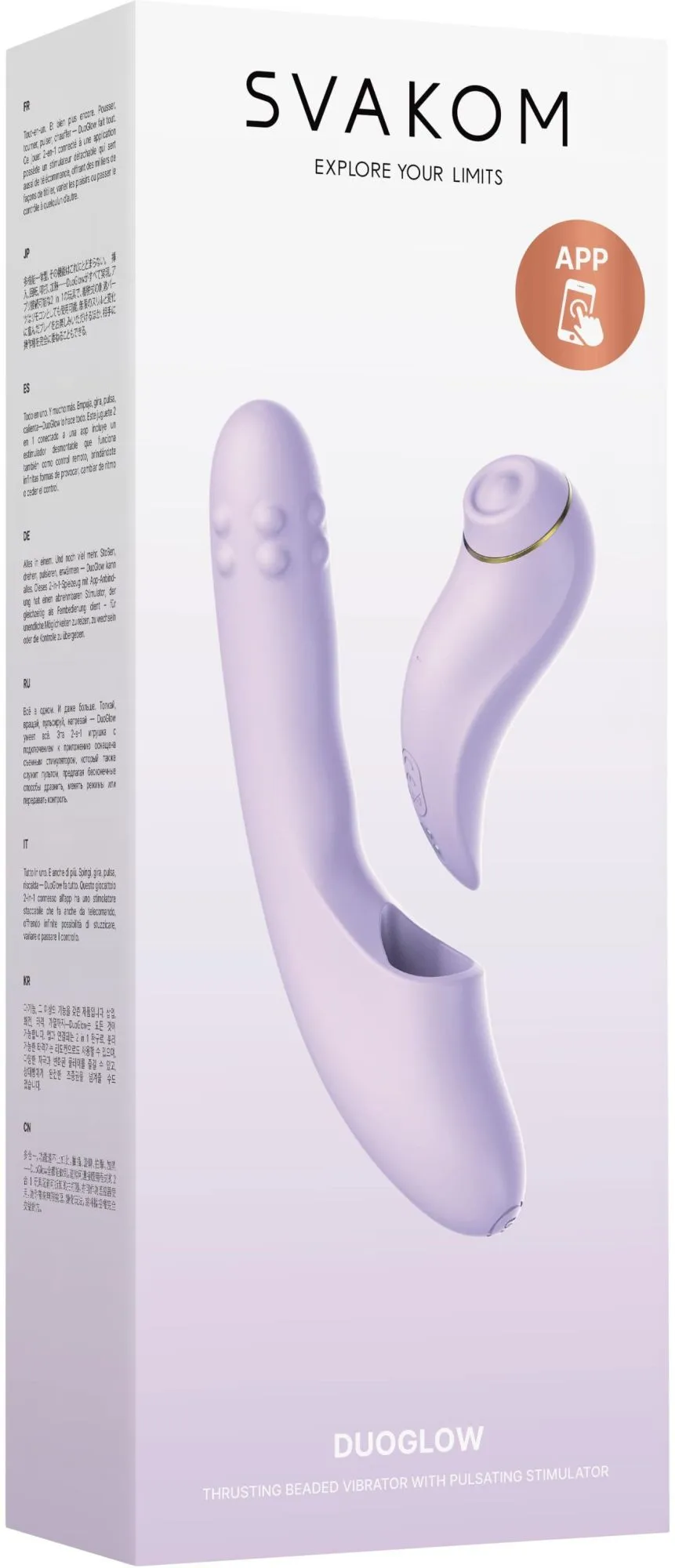 Многофункциональный вибратор Svakom DuoGlow с отсоединяемым клиторальным стимулятором — это качественная секс-игрушка формата “2в1”. Вы можете использовать вибратор и стимулятор одновременно—в роли вибратора-кролика для двойного удовольствия или снять клиторальную часть, чтобы наслаждаться каждым элементом отдельно.