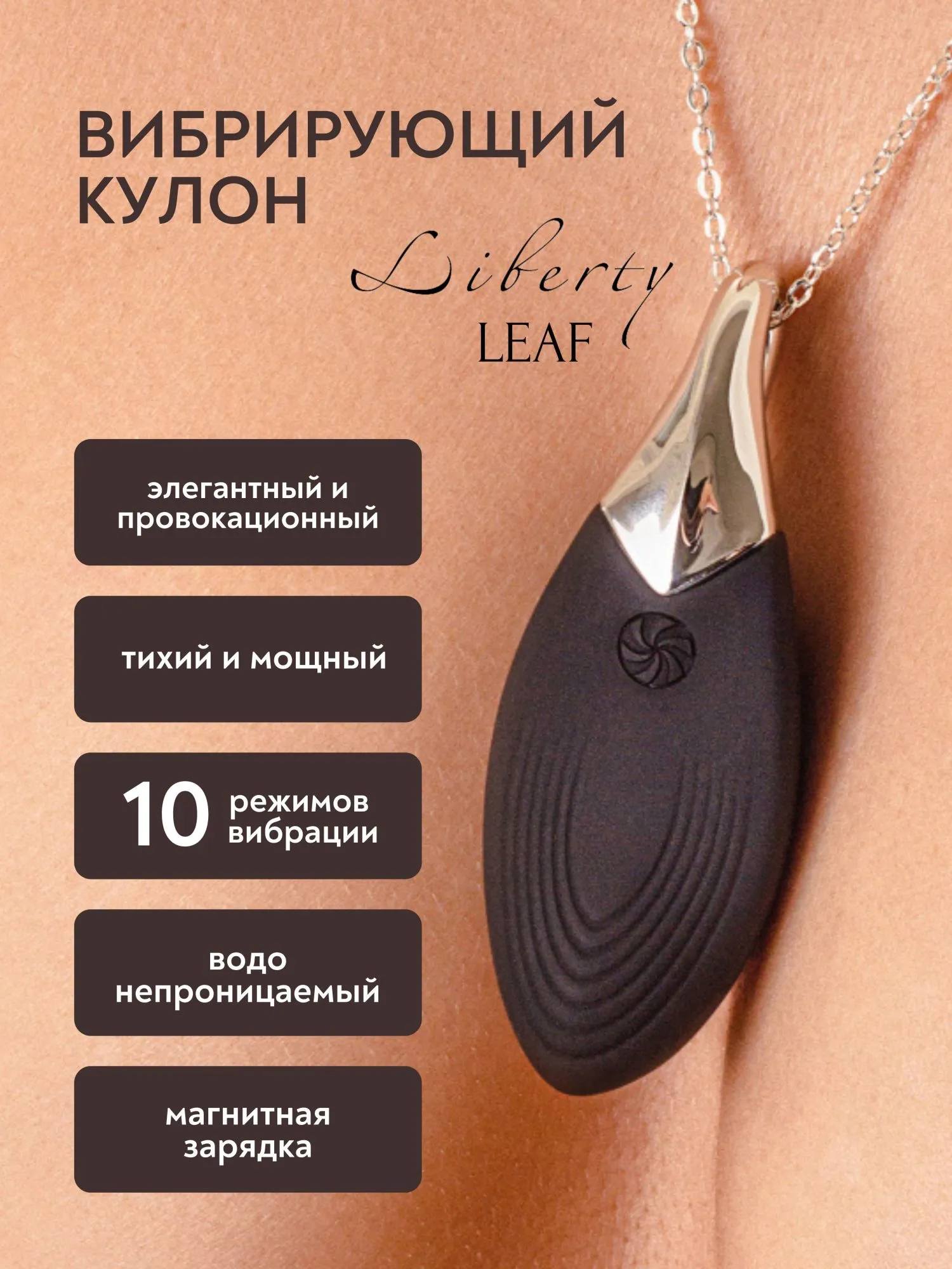Изысканный и соблазнительный вибратор в форме листочка, выполненный в элегантном черном цвете, который можно носить как ожерелье, имеет десять режимов вибрации. Он станет манифестом, провозглашающим ваше право на удовольствие. С этим аксессуаром становится возможным испытывать удовольствие в любом месте, потому что он всегда с вами. Цепочка из нержавеющей стали длиной 55 см серебристого цвета, делает вибратор идеальным для ношения в качестве стильного аксессуара. Одной из наиболее примечательных особенностей игрушки является ее бесшумная работа, что делает ее достаточно незаметной для использования в общественных местах. Кроме того, игрушка водонепроницаема по стандарту IPX6 и оснащена магнитной зарядкой. Изготовлена из бархатистого гипоалергенного силикона стандарта FDA. Время работы - 60 мин. Время зарядки - 35 мин.