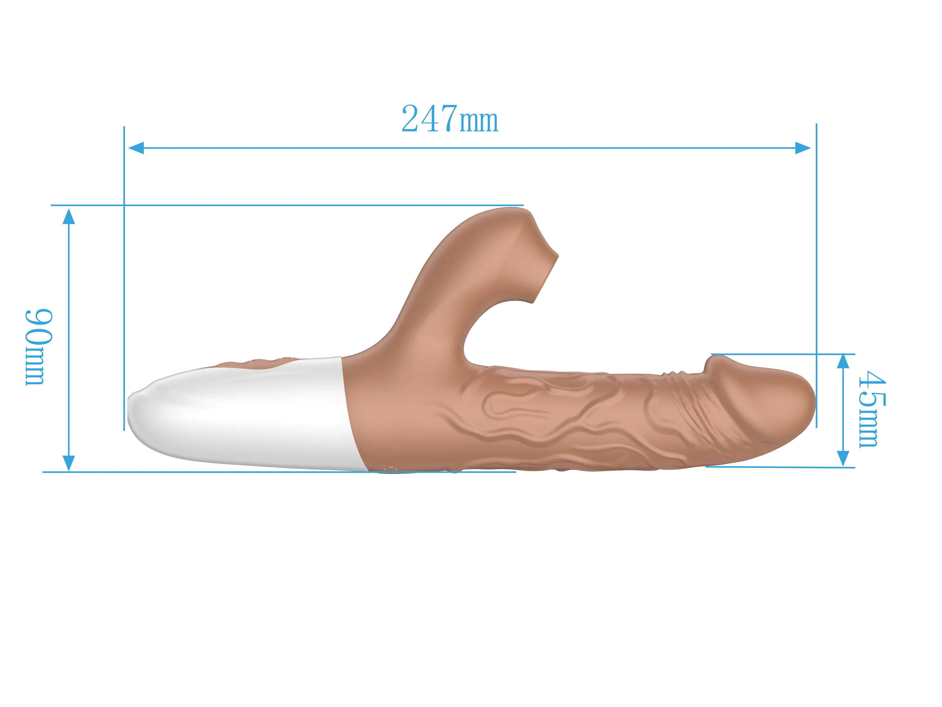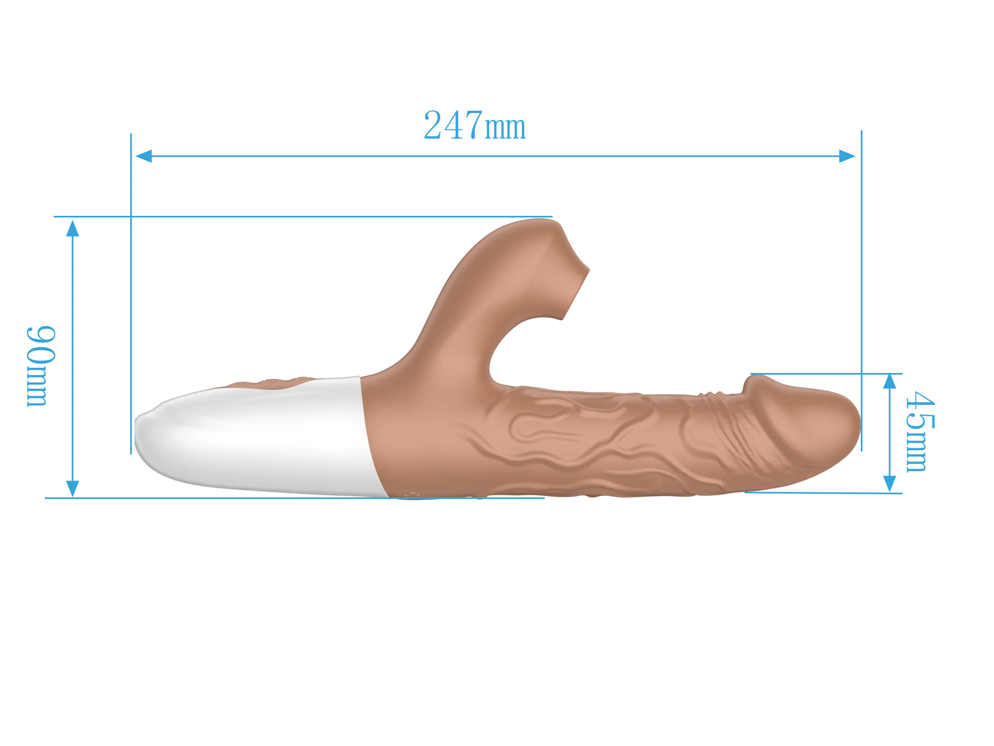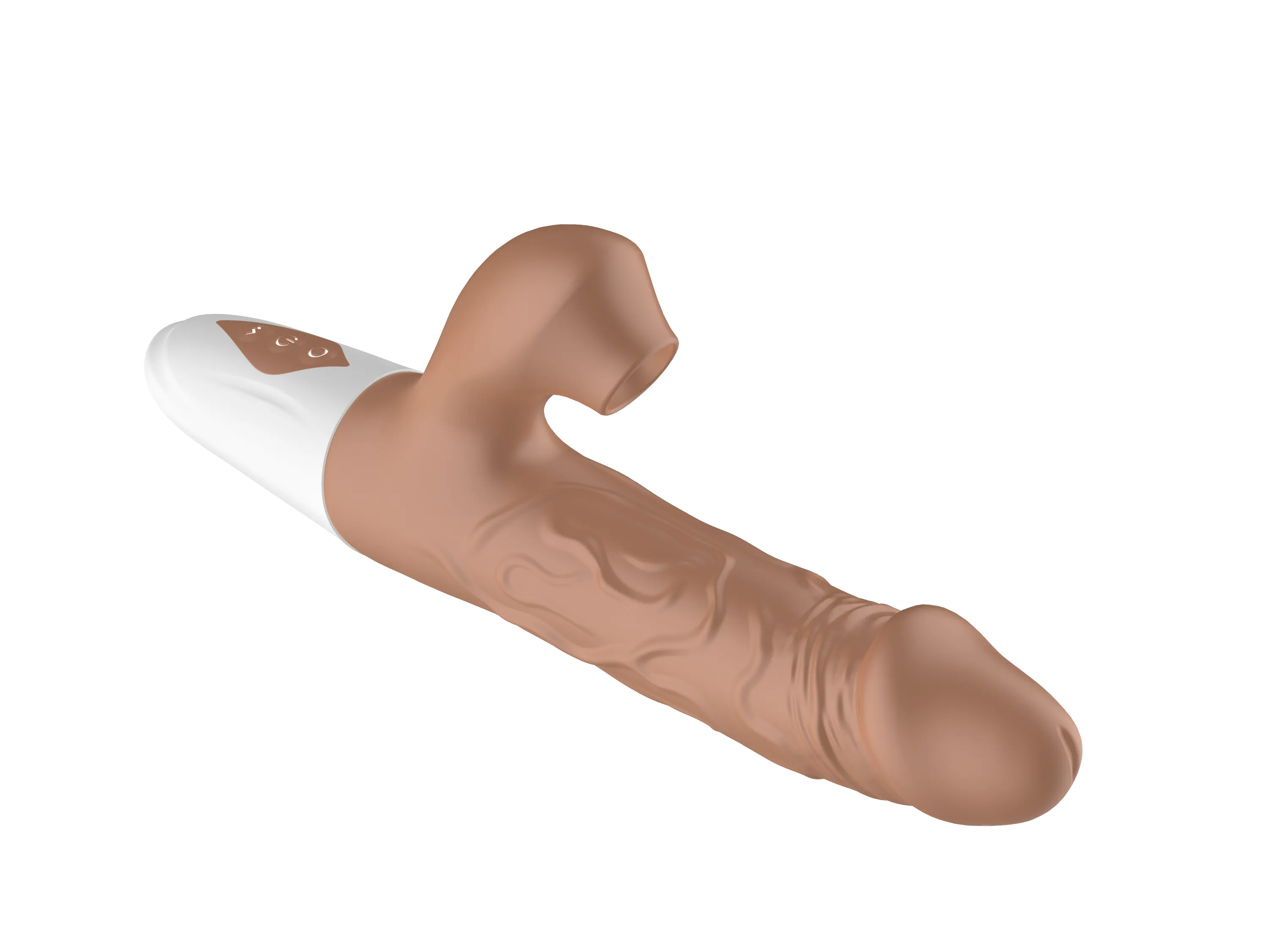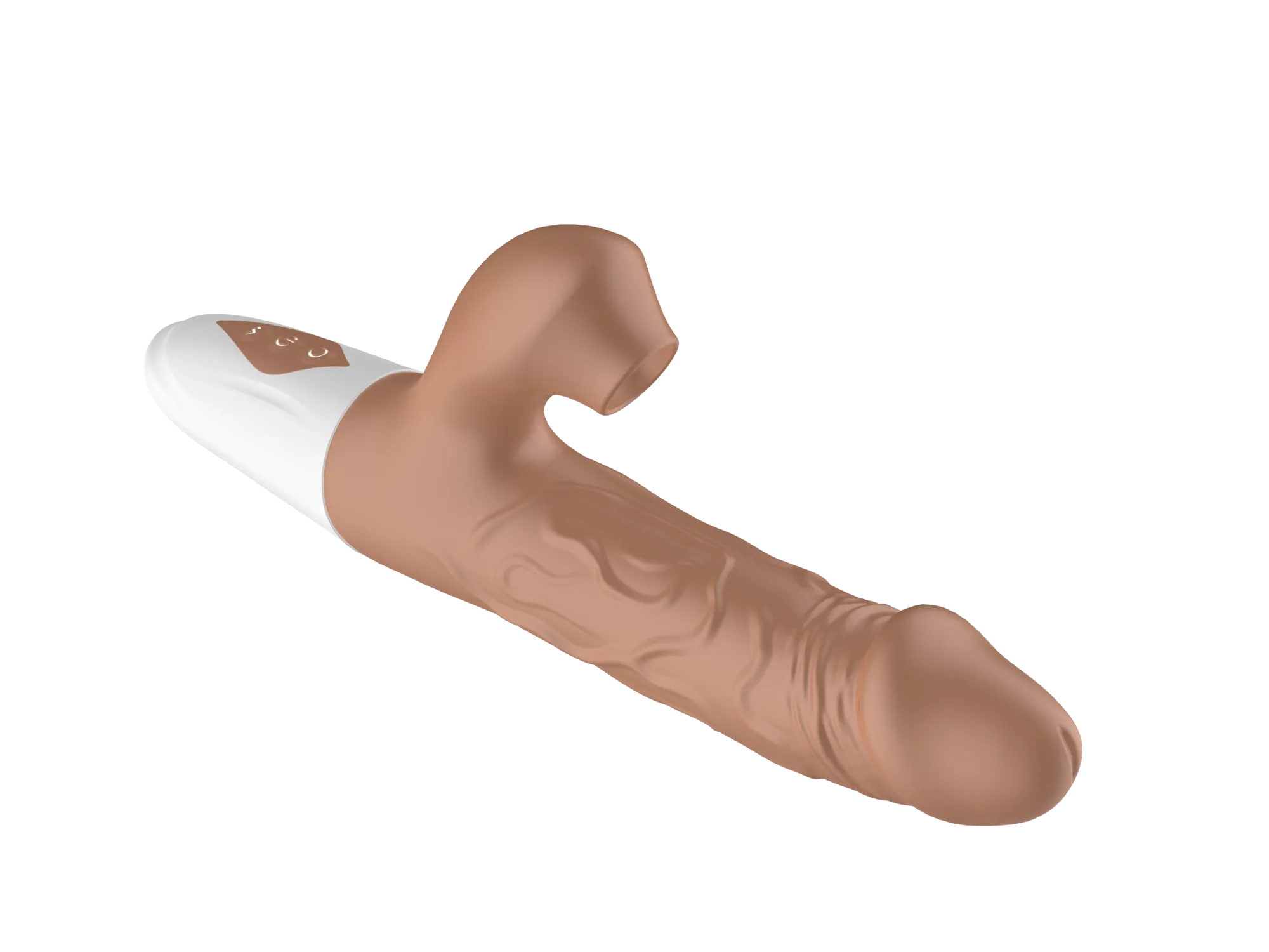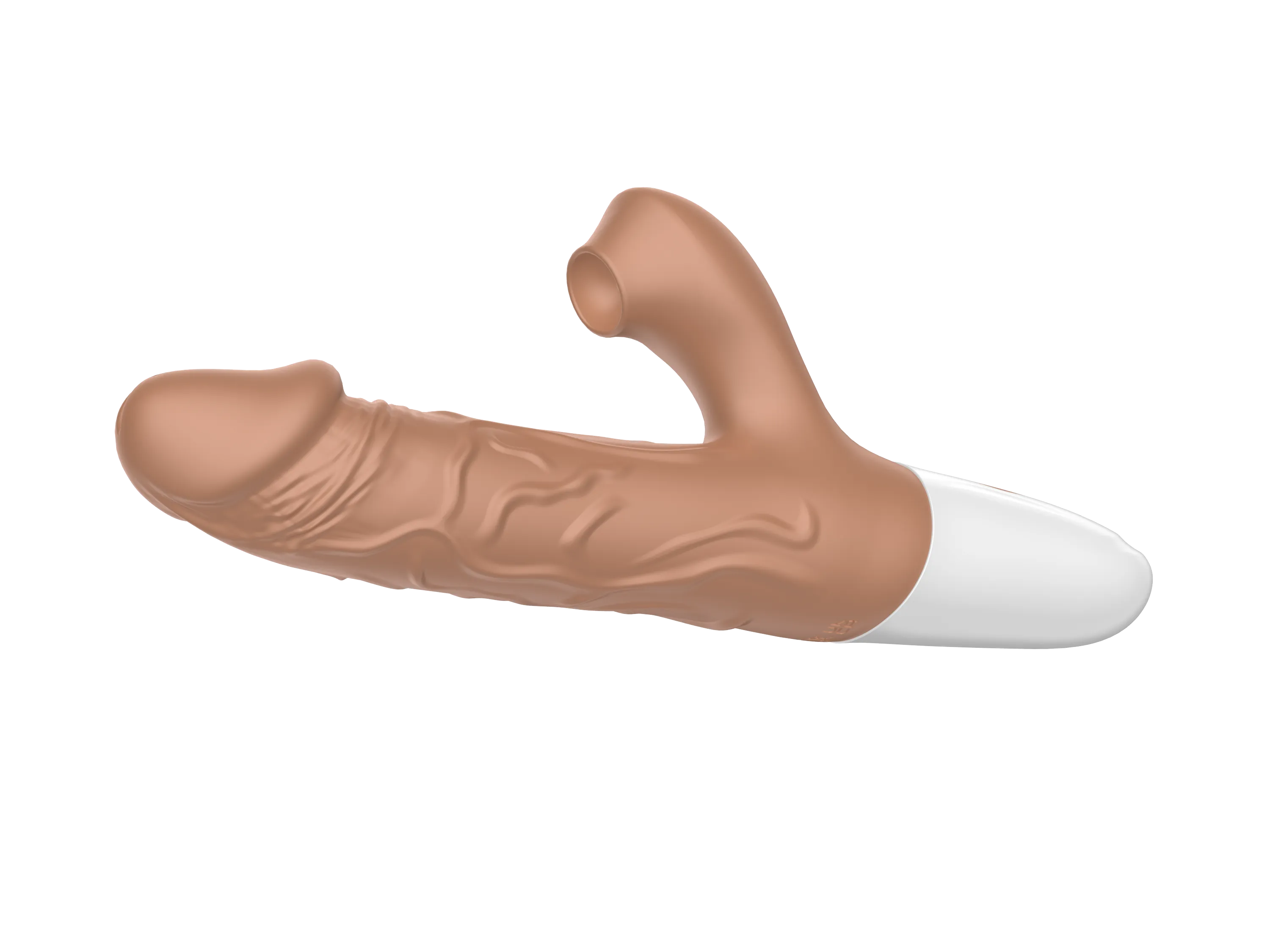 Вибратор-кролик в реалистичном дизайне в виде мужского пениса с текстурированными венами для большей стимуляции. Вибратор оснащен 10 режимами вибрации, 3 режимами пенетрации и 7 режимами сосания, что позволяет подобрать идеальную комбинацию для любого настроения.   Изготовленный из мягкого и безопасного силикона с ABS-пластиком, вибратор приятен на ощупь и гипоаллергенен. Водонепроницаемость IPX7. Вес: 222 г., размеры: 225*90*40 мм. Длина клиторального отростка - 5см, ширина - 2,7см, диаметр раструба - 1,5см.  Устройство оснащено перезаряжаемой литиевой батареей, которая обеспечивает до 45 минут работы. При этом уровень шума не превышает 50 дБ, гарантируя тихую и дискретную эксплуатацию.