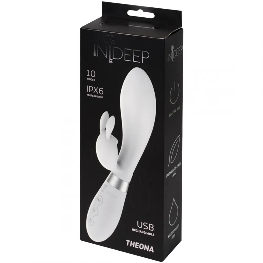 Вибромассажер Theona, изготовленный из безопасного медицинского силикона, имеет 10 режимов вибрации и два моторчика, расположенные в основной рабочей части и в клиторальном отростке массажера. Моторчики способны одновременно воздействовать на самые эрогенные зоны, вызывая приятные ощущения. Вы можете использовать Theona как самостоятельно, так и в паре с партнером во время прелюдии для разнообразия интимной жизни. Характеристики: материал- силикон, общая длина- 21,5 см, рабочая длина - 10 см, максимальный диаметр - 3,5 см, длина отростка- 6,5 см, максимальный диаметр отростка- 2,4 см. Водонепроницаемый (IPX6). Удобное и легкое управление, USB-перезаряжаемый. Материал: силикон. Упаковка: картонная коробка с принтом.