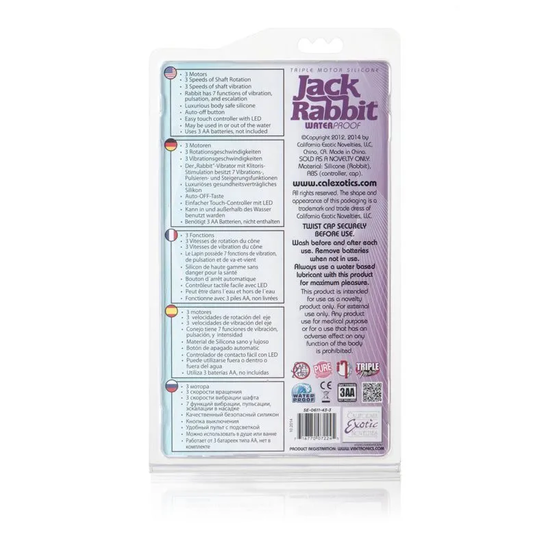 Triple Motor Silicone Jack Rabbit выполнен из качественного силикона и полностью водонепроницаем. Режимы вибрации и ротации управляются при помощи кнопок на корпусе игрушки. Режимы вибраций клиторального стимулятора и ствола могут работать независимо друг от друга. Панель с кнопками имеет подсветку, поэтому даже в темноте управление не вызовет у Вас затруднений.