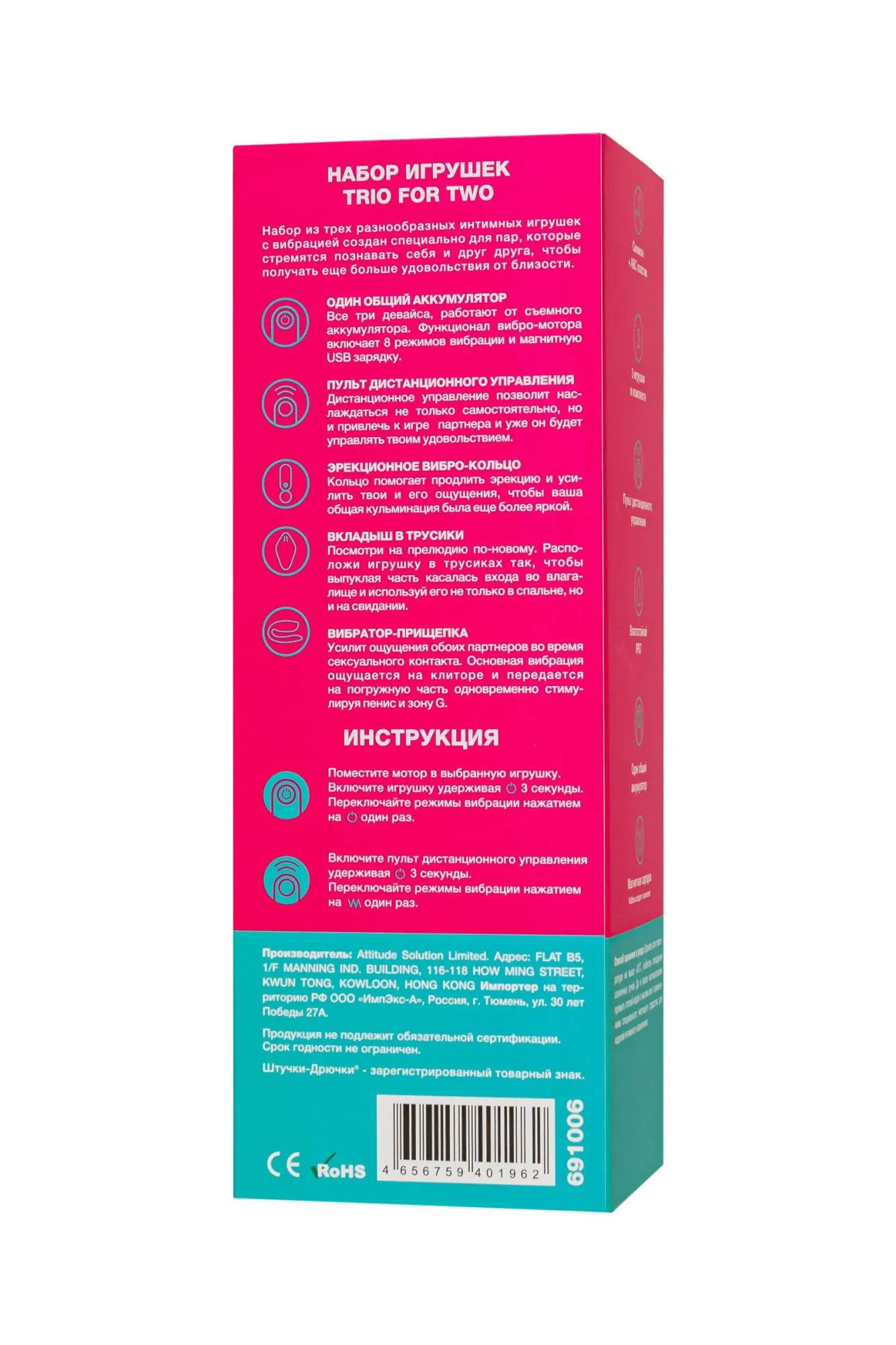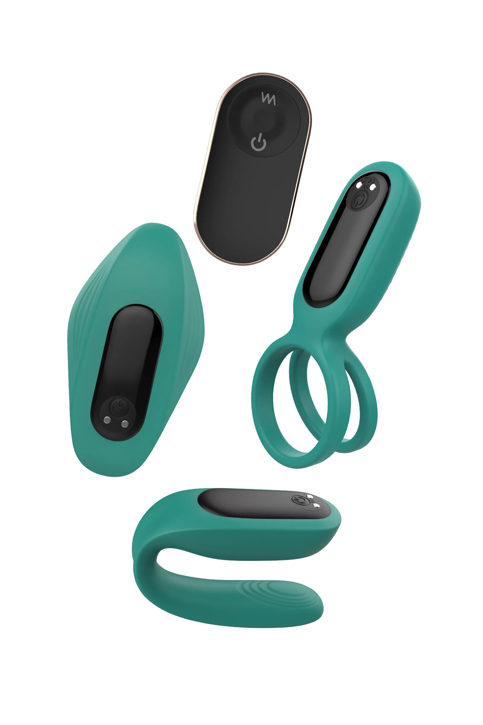 Мир меняется и вместе с ним пробуждается желание узнавать свое тело лучше и глубже. Набор из трех разнообразных интимных игрушек с вибрацией создан специально для пар, которые стремятся познавать себя и друг друга, чтобы получать еще больше удовольствия от близости. Эрекционное кольцо, вкладыш в трусики и вибратор-прищепка для одновременной стимуляции. Все три девайса, работают от съемного аккумулятора-вибратора и управляются с помощью пульта. Функционал вибромотора включает 8 режимов вибрации и магнитную USB зарядку. Игрушки выполнены из качественного шелковистого силикона насыщенного изумрудно-зеленого цвета. Для комфортного использования рекомендуется использовать с лубрикантом на водной основе. Эрекционное вибро-кольцо помогает продлить эрекцию и усилить твои и его ощущения, чтобы ваша общая кульминация была еще более яркой. Диаметр колец для пениса и мошонки - 39 мм,ширина - 42 мм, длина - 98 мм Вкладыш в трусики поможет по-новому взглянуть на прелюдию. Расположи игрушку в трусиках так, чтобы выпуклая часть касалась входа во влагалище. А твой партнер с помощью пульта может управлять твоим удовольствием. Такой мини-вибратор легко использовать даже вне спальни, например, на свидании. Длина - 90 мм, ширина - 49 мм. Вибратор-прищепка усиливает ощущения обоих партнеров во время сексуального контакта. Основная вибрация ощущается на клиторе, гибкая погружная часть передает более мягкую вибрацию, одновременно стимулируя пенис и зону G. Длина - 70мм, ширина - 54мм, длина погружной части - 79мм, ширина погружной части - 15мм.