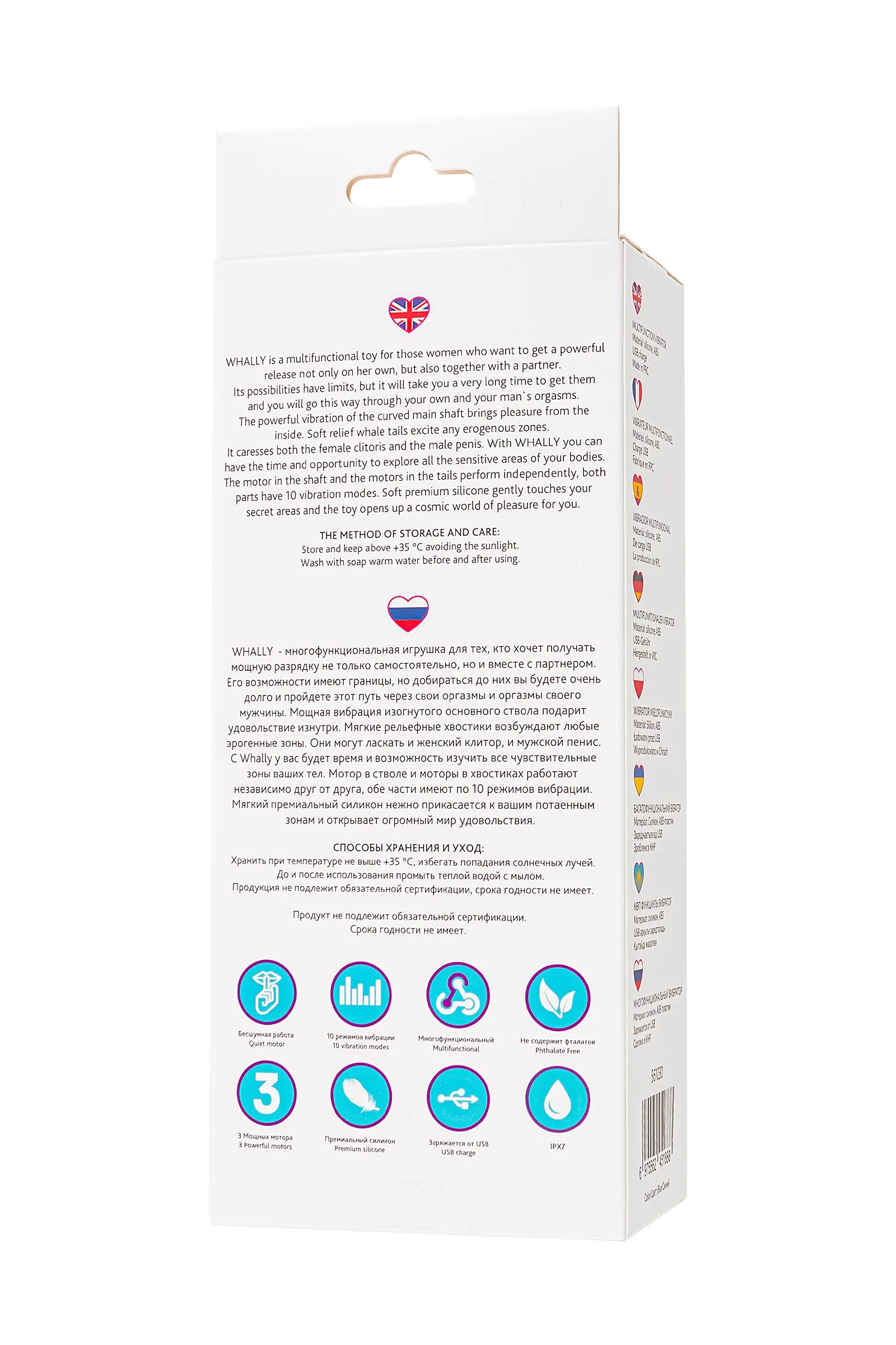 WHALLY от бренда L`Eroina – это идеальный выбор для тех, кто ищет многофункциональную игрушку, способную доставить максимальное удовольствие как самостоятельно, так и с партнером. WHALLY - это парная игрушка с безграничными возможностями, которые вы будете исследовать на протяжении долгого времени, наслаждаясь каждым мгновением. Основной ствол с изогнутой формой и мощной вибрацией позволяет наслаждаться сильными ощущениями изнутри. Особый изгиб отлично стимулирует зону G. А мягкие рельефные хвостики на другом конце и их регулируемые скорости позволяют ласкать любые эрогенные зоны – от клитора до пениса. Игрушка может использоваться для анальных ласк, для этого не забудьте воспользоваться презервативом. 3 мощных мотора – в стволе и хвостиках работают независимо друг от друга, предлагая вам по 10 разных режимов вибрации в каждой части, которые вы можете настроить на свой вкус. Только представьте какие оргазмы вам предстоит испытать, прежде чем функционал игрушки будет изучен полностью. WHALLY изготовлен из мягкого премиального силикона, который нежно касается вашей кожи, придавая особую чувственность и комфорт. Шелковистое бесшовное покрытие из силикона делает использование игрушки не только гигиенически безопасным, но и тактильно приятным. Для большего комфорта воспользуйтесь лубрикантом на водной основе. Используйте его соло или с партнером, чтобы наслаждаться мощными оргазмами. Чтобы испытать весь спектр удовольствия, возьмите игрушку с собой в душ, ванну и бассейн. Водонепроницаемость уровня IPX7 позволяет получать удовольствие в воде до 30 минут. WHALLY от L`Eroina – это игрушка, которая поможет вам раскрыть свои потаенные зоны и дать вам мир безграничного удовольствия. Материал - силикон, цвет - ярко-голубой 10 режимов вибрации 3 мощных и бесшумных мотора Общая длина 18,5 см, рабочая длина 12,5 см, диаметр вибратора 3,5 см Длина хвостиков 8 см, диаметр хвостиков 1,3 см Водонепроницаемость - IPX7 Магнитная USB-зарядка (кабель в комплекте) Время зарядки - 3 часа Время использования до 60 минут