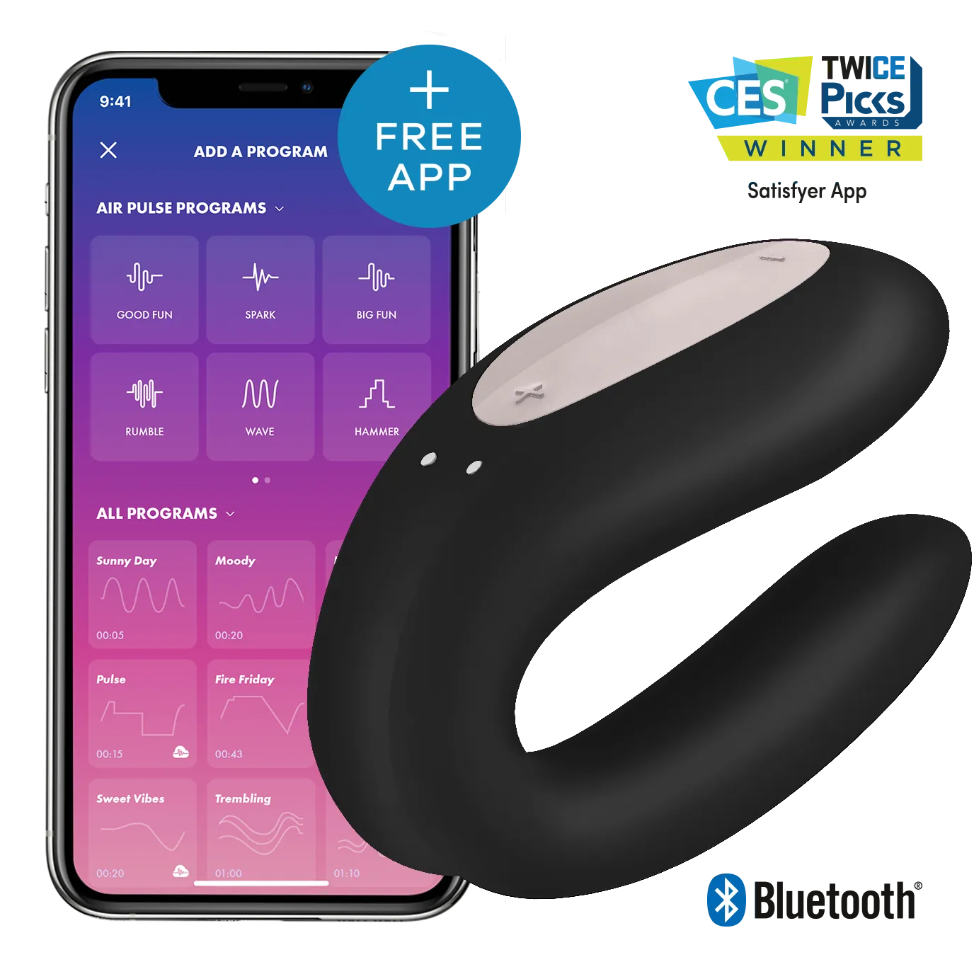 Double Joy- это вибратор для пары и дополнительное удовольствие во время занятий любовью благодаря одновременной стимуляции обоих партнеров. Благодаря своей эргономичной форме он добавляет вам удовольствия и предлагает захватывающие, интенсивные занятия любовью. Современная U- форма c бархатистой гладкой силиконовой поверхностью придают игрушке уникальный дизайн, который наполнит вас желанием. Одним нажатием кнопки Вы можете выбрать одну из трех интенсивностей вибрации и семи ритмов вибрации. Материал: силикон и пластик. Заряжается при помощи USB-кабеля (входит в комплект). Водонепроницаемый. Имеет 10 режимов. Вибратор оснащен системой Bluetooth, и управление может осуществляться через бесплатное мобильное приложение Satisfyer, либо кнопками на устройстве.