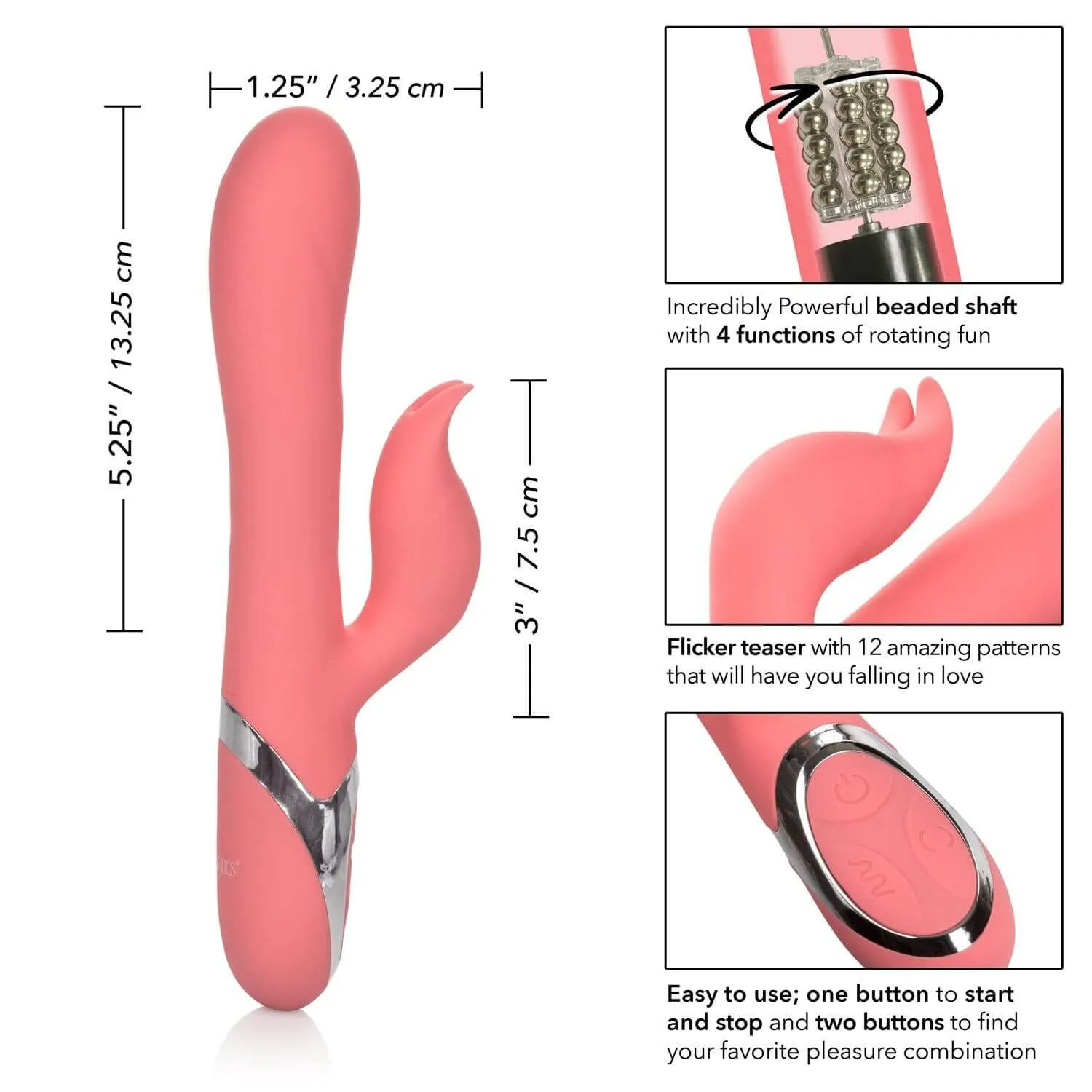 Enchanted Tickler выполнен из качественного медицинского силикона. Этот материал полностью гипоаллергенен и не содержит фталатов. Управление вибратором происходит при помощи трех кнопок, расположенных в основании. А благодаря функции запоминания последнего использованного режима, Вы сможете начать с того момента, на котором остановились в прошлый раз. Вибратор оснащен перезаряжаемым аккумулятором, а также LED индикатором уровня заряда.