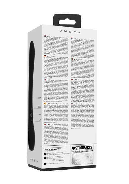 Ombra – невероятно гибкий вибромассажер, споcобный идеально подстраиваться под строение тела. Он изготовлен из высококачественного, мягкого, нежного на ощупь 100% медицинского силикона с пылеотталкивающими свойствами и прочного, элегантного АБС-пластика. Вибромассажер оснащен инновационным электродвигателем нового поколения F1. Преимущество такого типа двигателя в том, что он делает интенсивную стимуляцию очень мягкой даже при мощном максимальном воздействии. Игрушка имеет мощный мотор, который обеспечивает 10 функций вибрации, способной достигать 7200 оборотов в минуту.