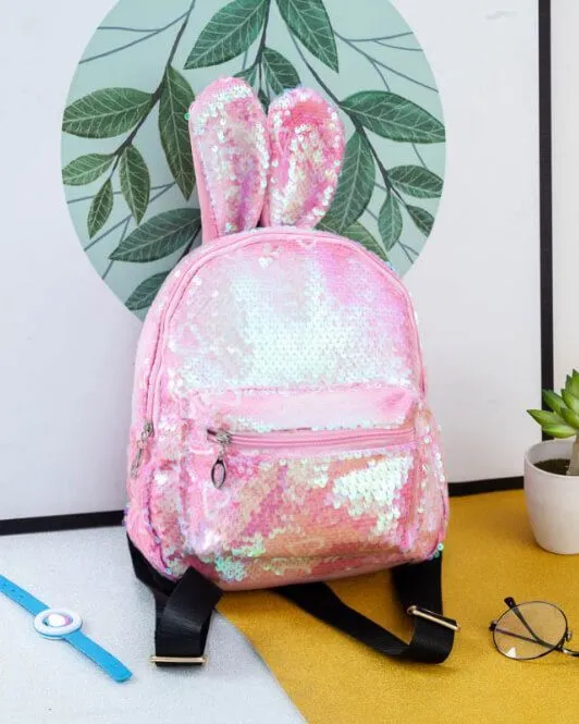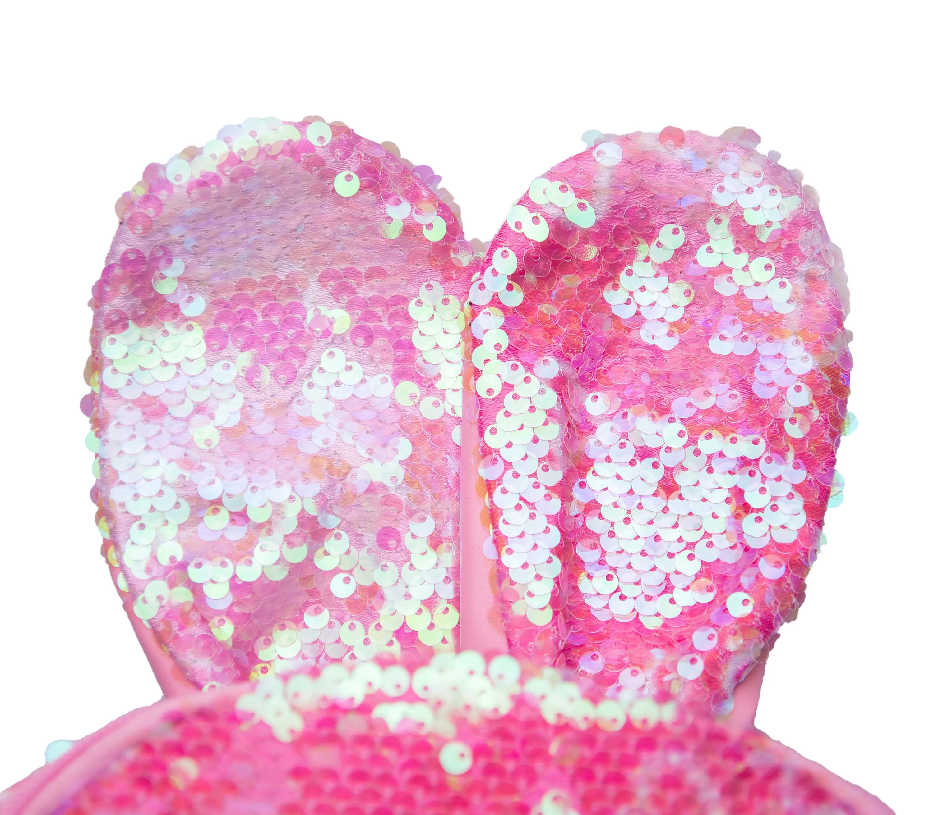 Очаровательный розовый рюкзак с ушками, усыпанный переливающимися пайетками.
